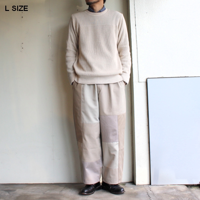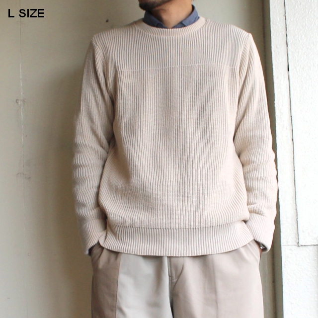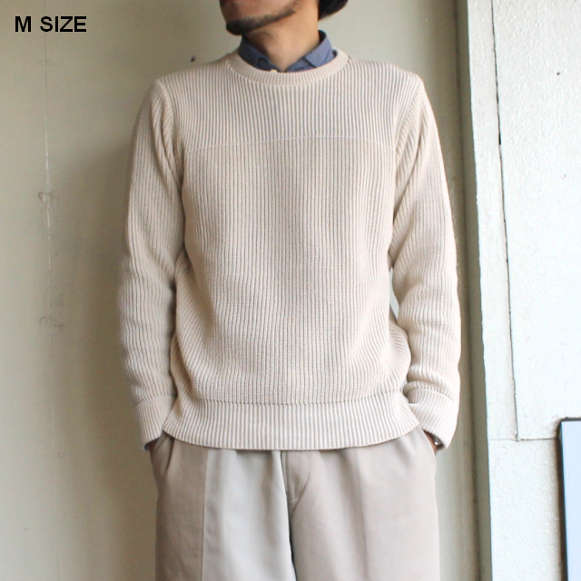 よく見ると、胸の位置から上下で若干の編み目に変化がある技ありニットです。