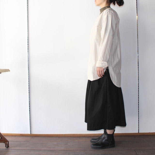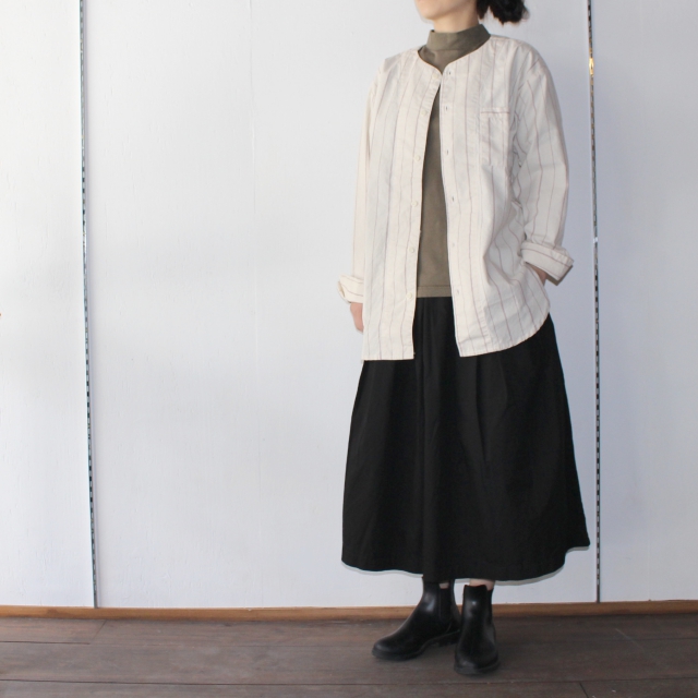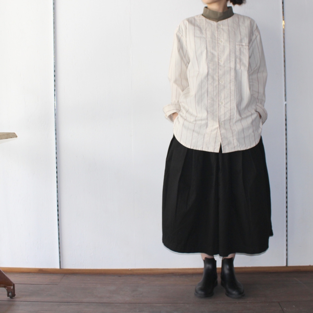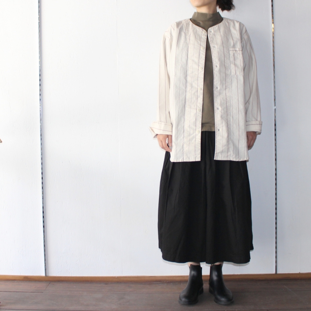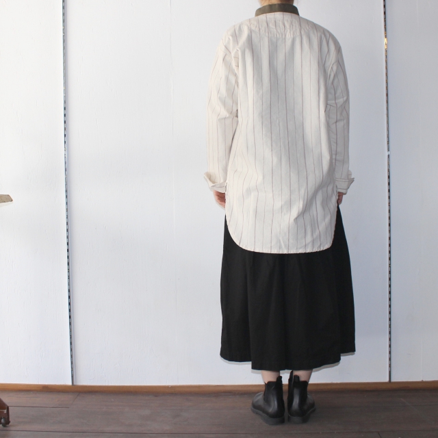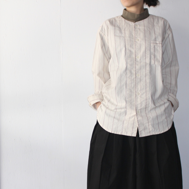生成りの生地にさりげないストライプ柄をあしらったオリジナルのシャツ。