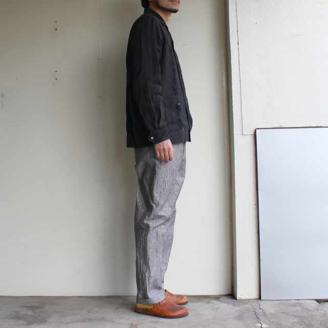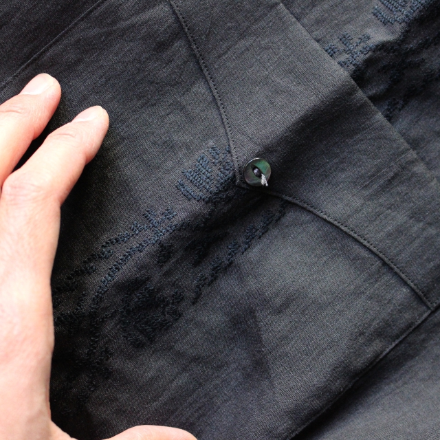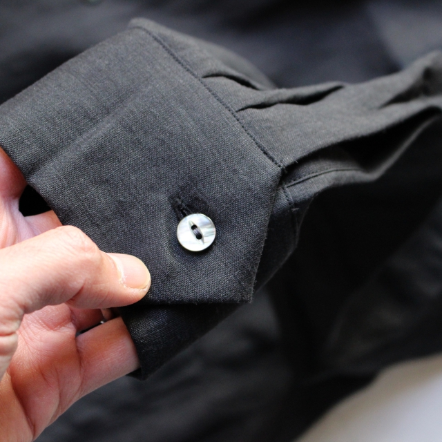 ボタンは生地色に合わせ、黒蝶貝のボタンを使用。