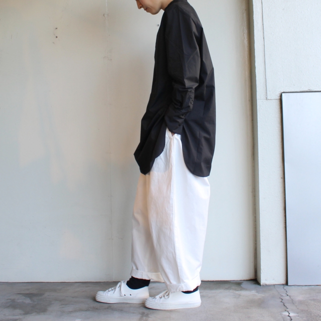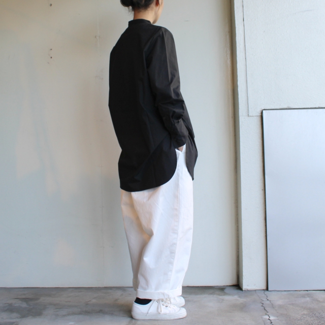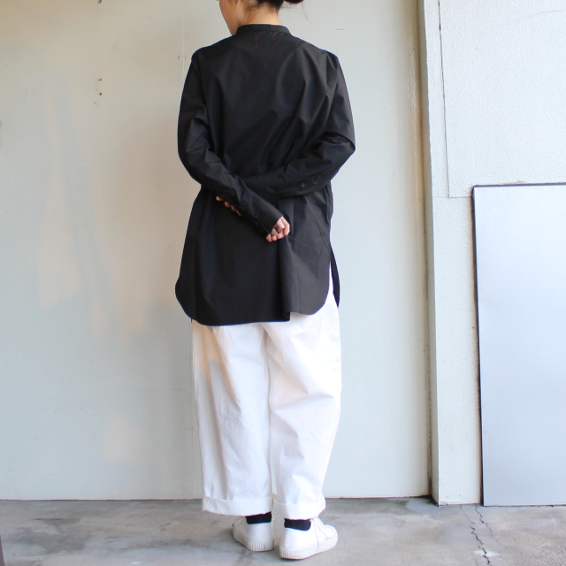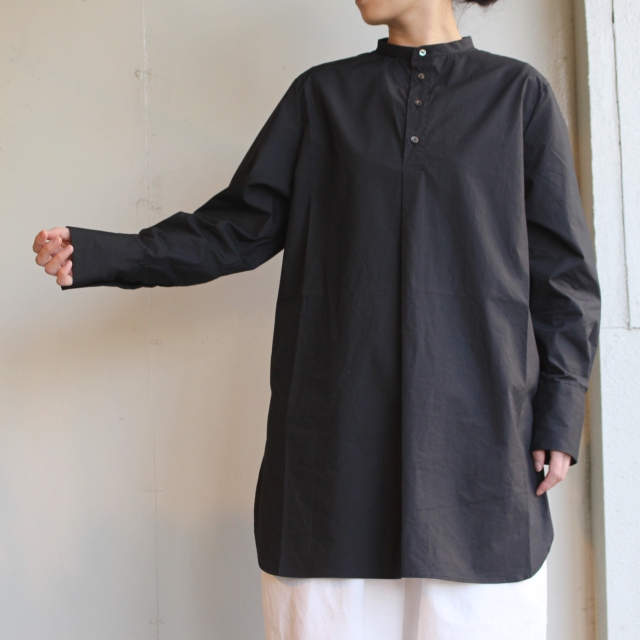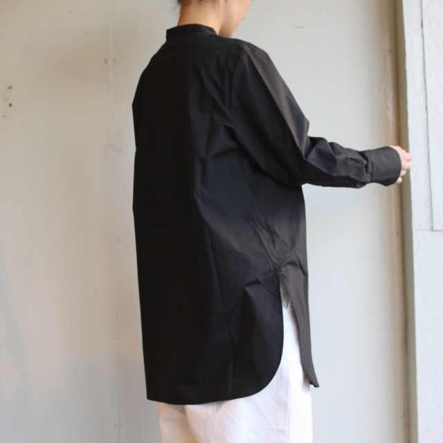 バンドカラーで着丈を長めに設定した、シンプルでありながら1枚で存在感のあるシャツです。