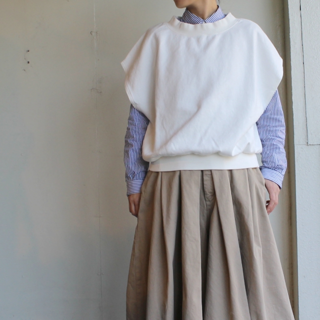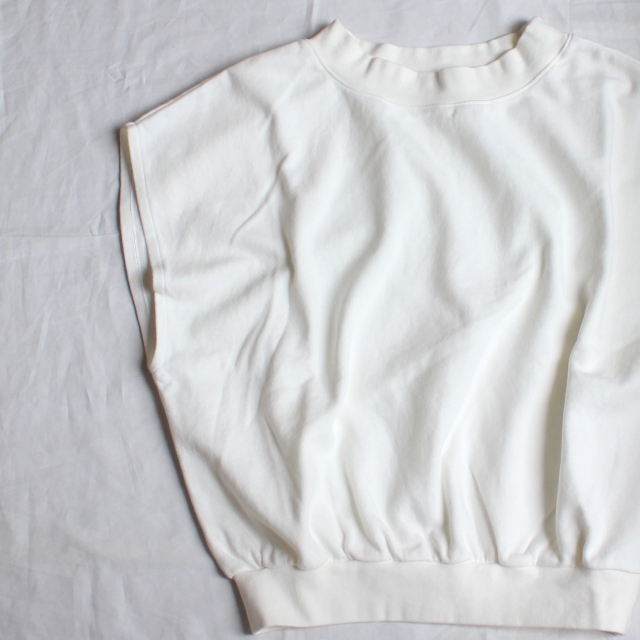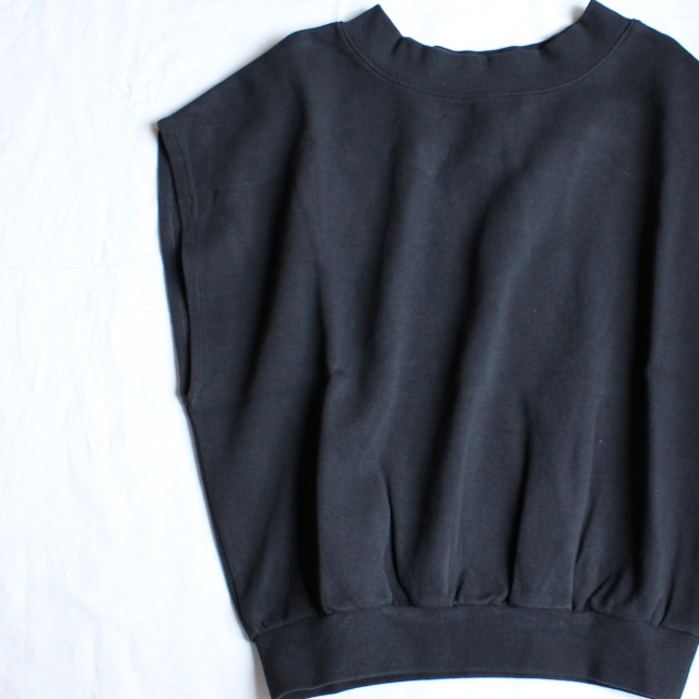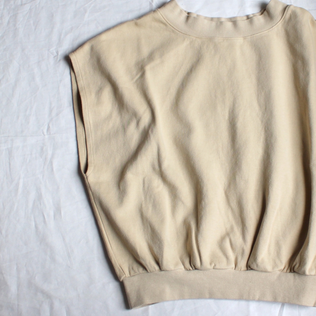 スウェットのような質感のダンボールニット生地に使用したノースリーブトップス。