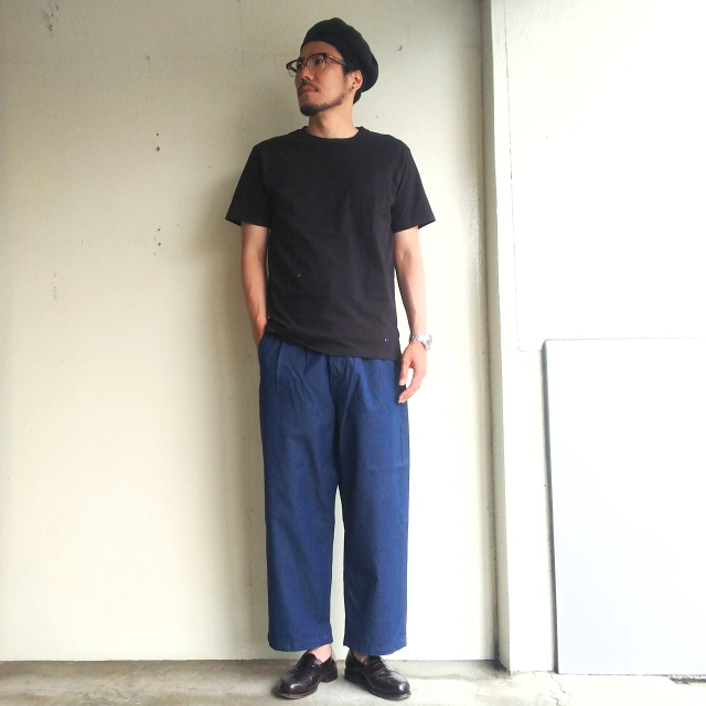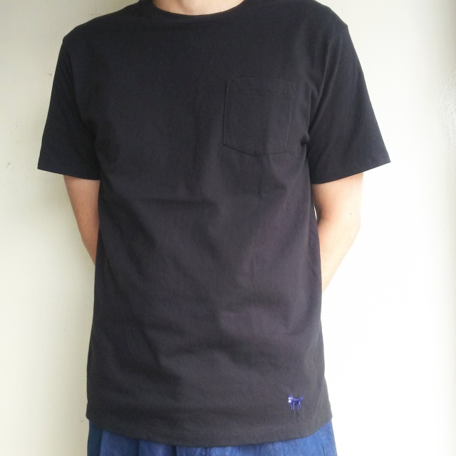 シンプルなポケットつきTシャツに刺繍のパグちゃんをアクセントにした1枚。
