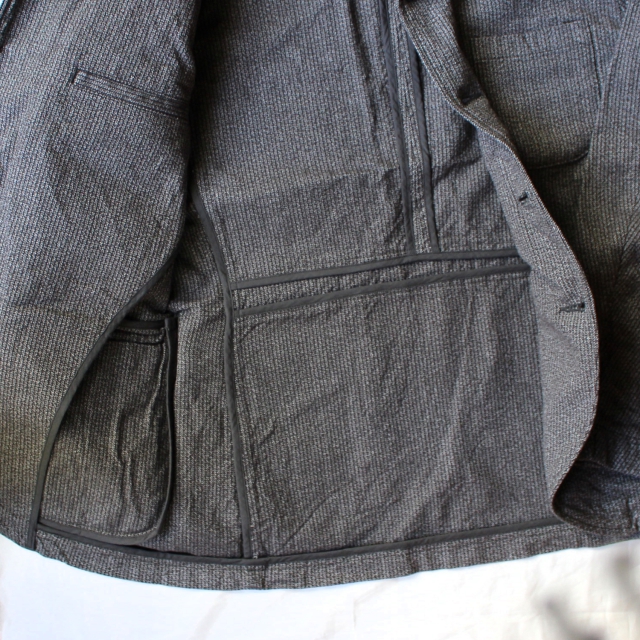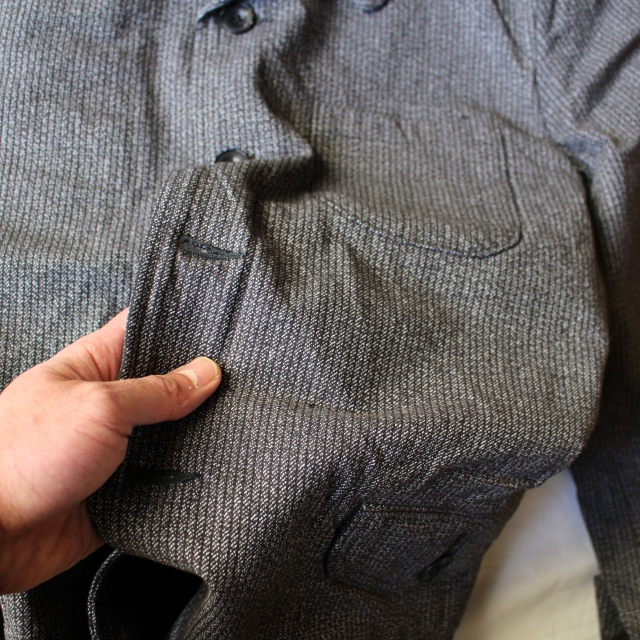 首元のチンストラップ、襟裏のダイヤモンドステッチ、袖の本切羽仕様、生地裏のパイピング処理など随所に丁寧な仕上がりがみられるジャケットです。