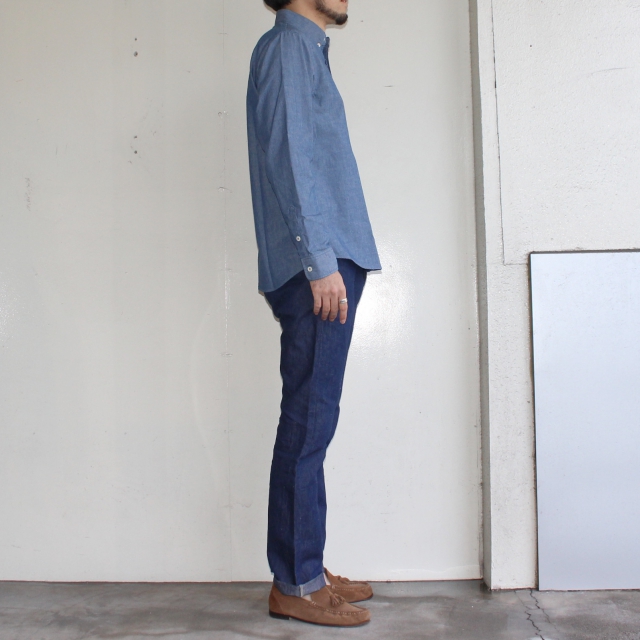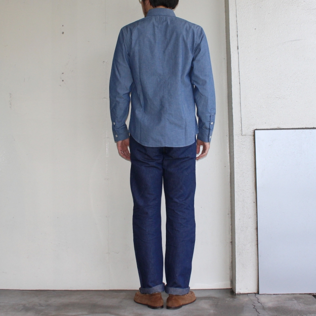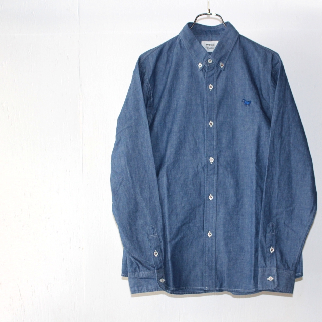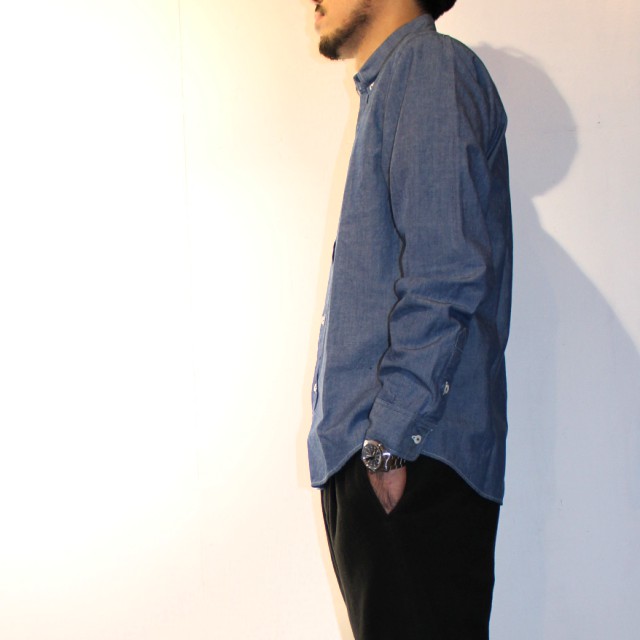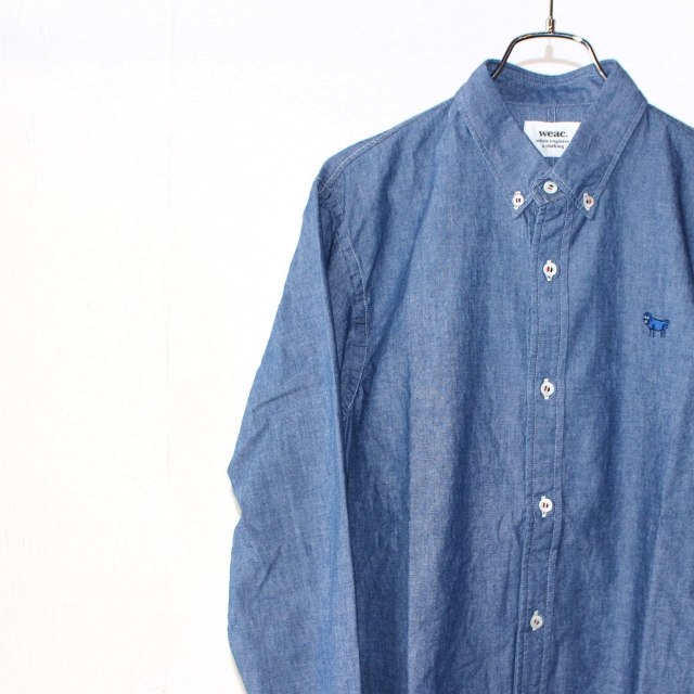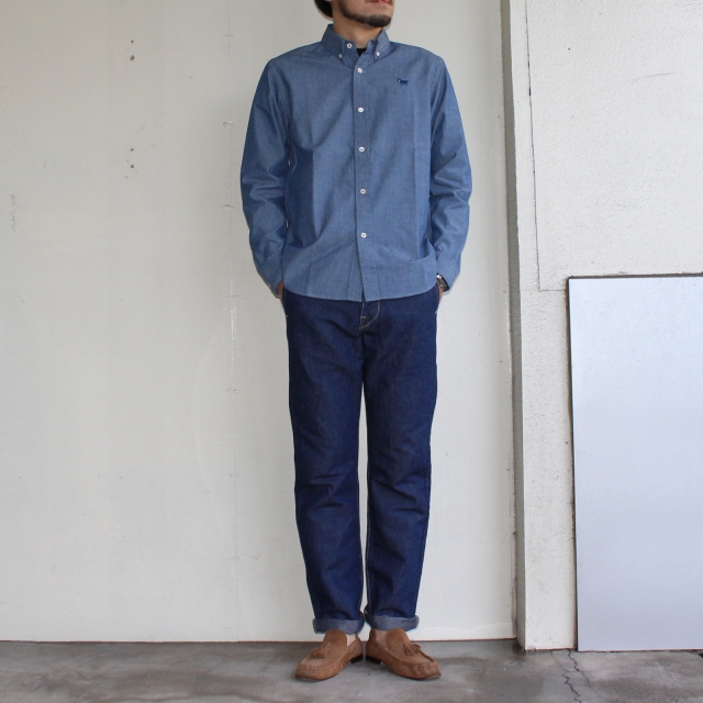 シャンブレー生地のボタンダウンシャツに胸の刺繍がポイント。