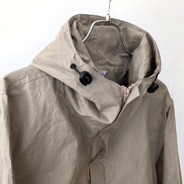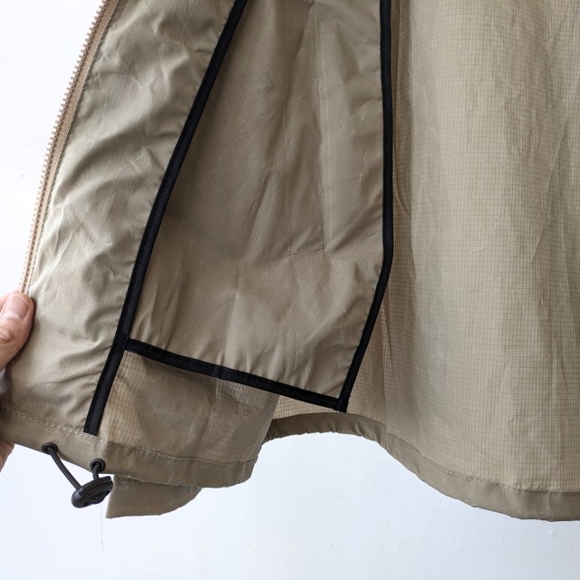 フードは立ち上がりのいい2枚仕立て、さらにドローコード付きで調整も可能。