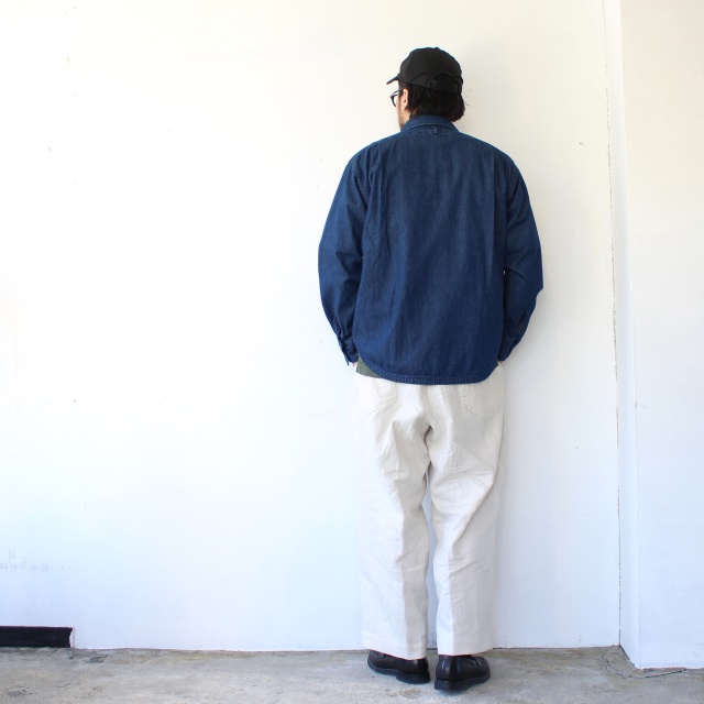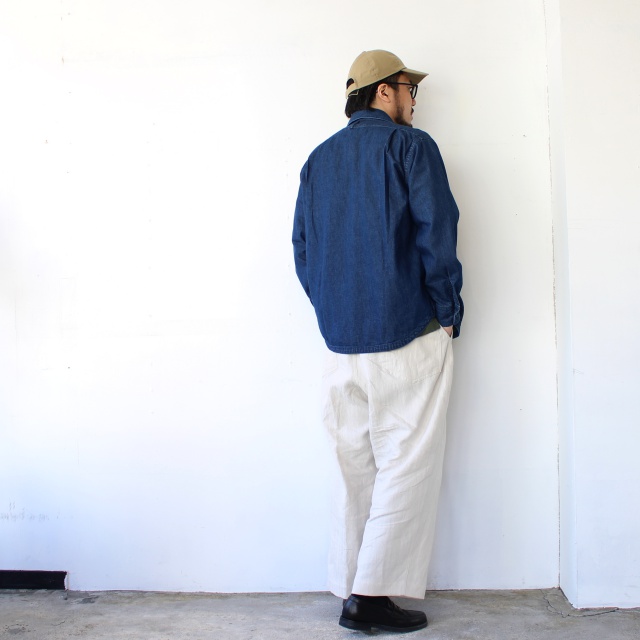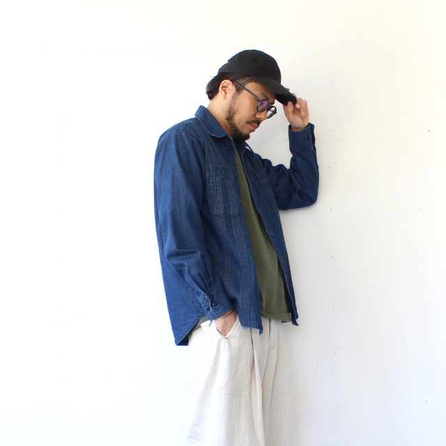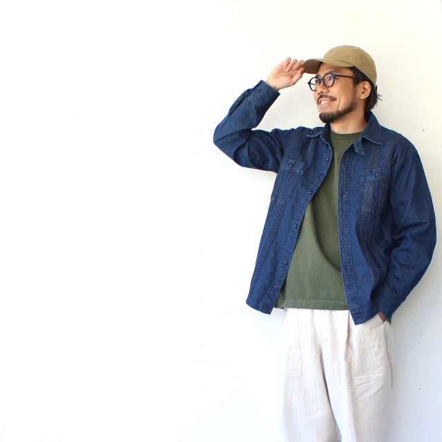 パリッとしたハリ感がありながら、ピーチスキン加工(微起毛)による表面の滑らかな質感が特徴で通年被りやすい生地。