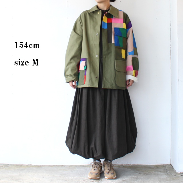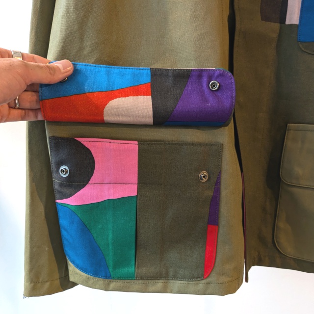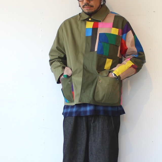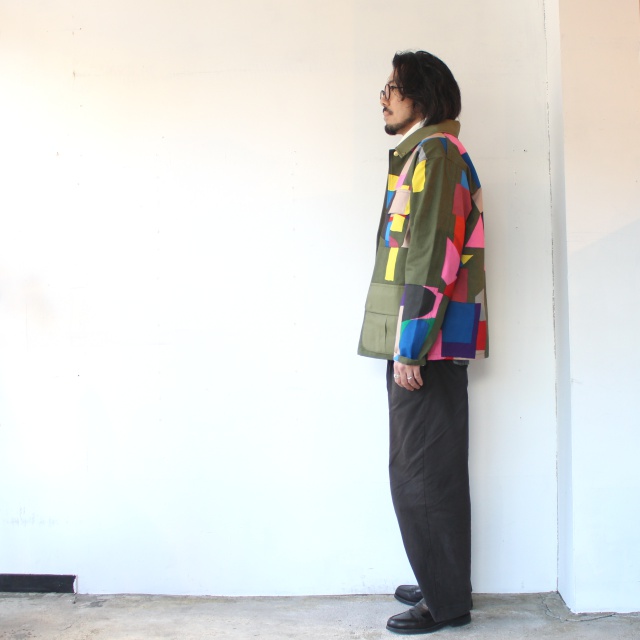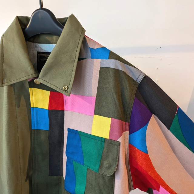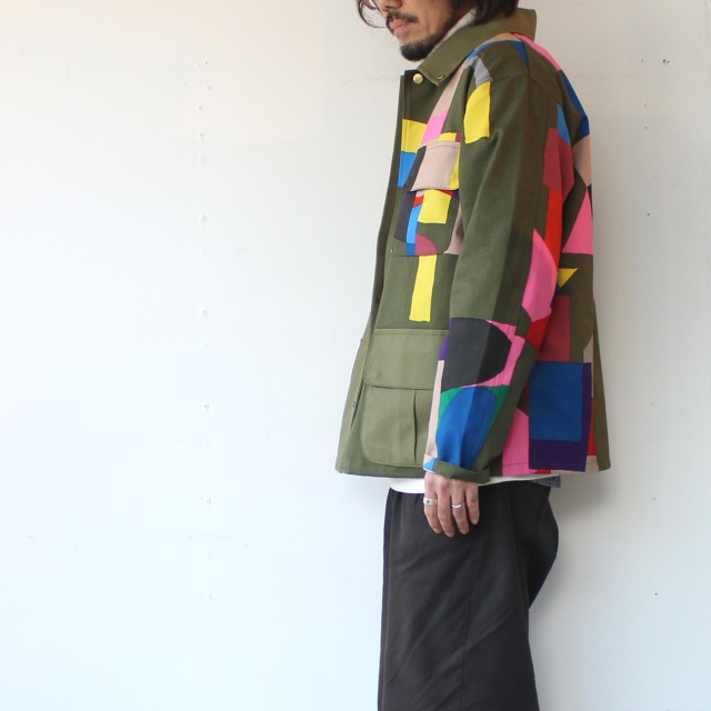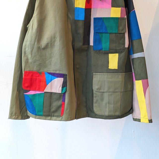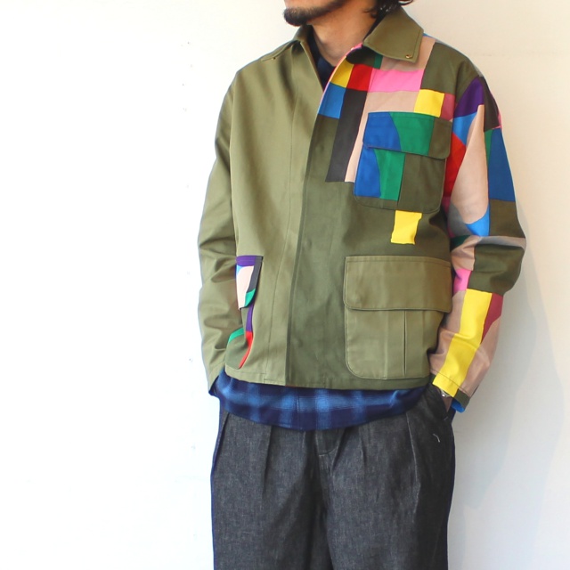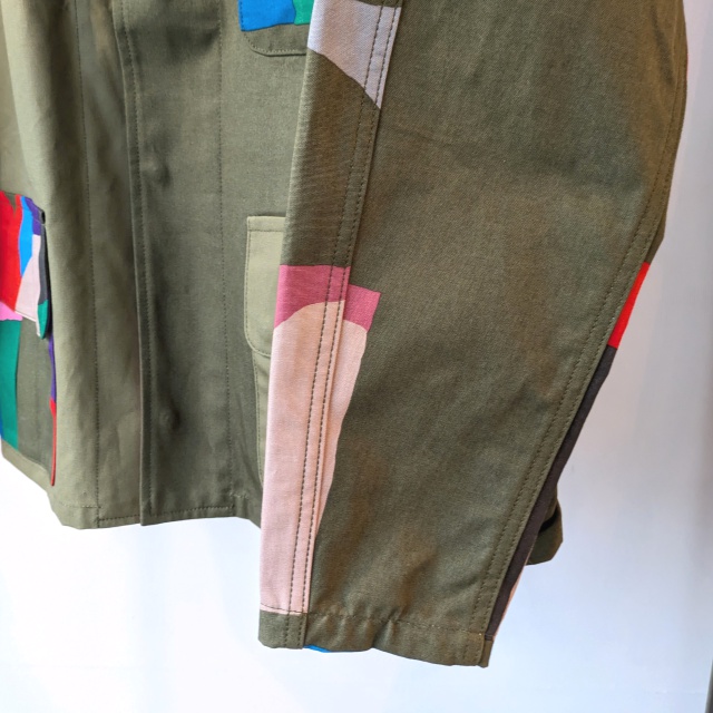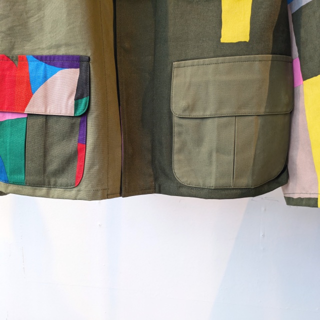 ■ パッチワークライクプリントワークジャケット Abstraction canvas × solid flap work jacket
