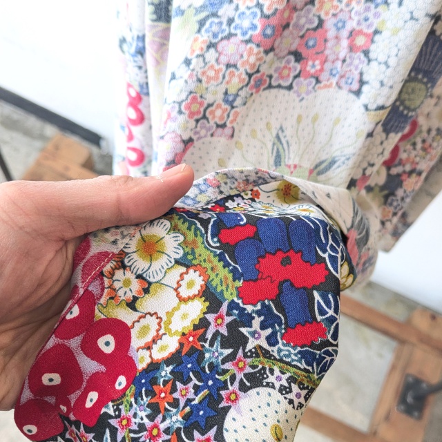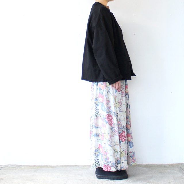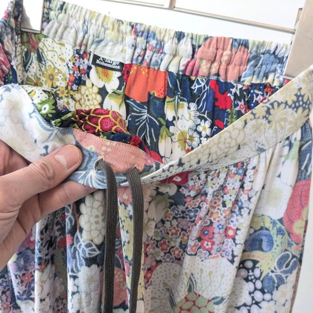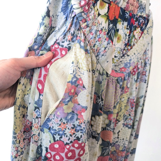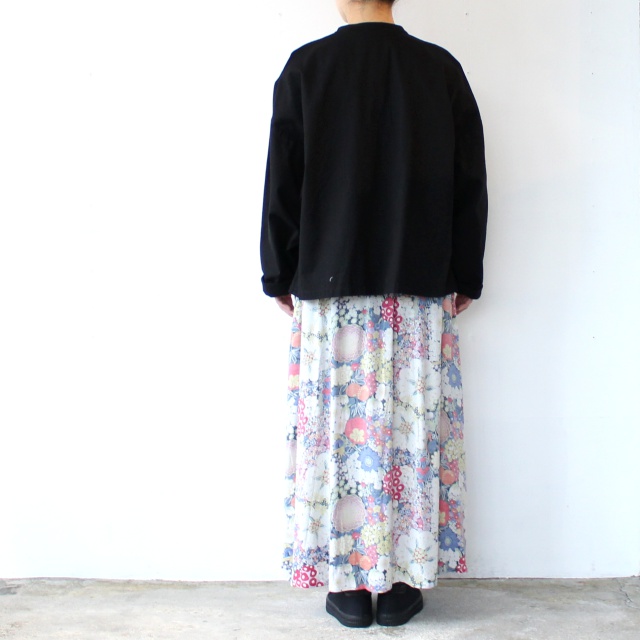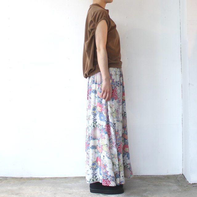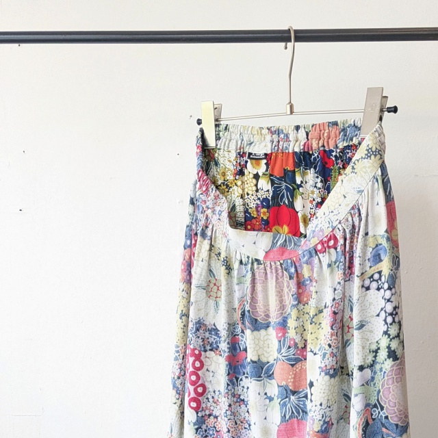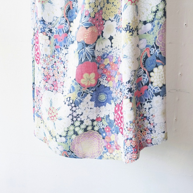 生地のプリント面を、表裏逆に使用した花柄スカート。