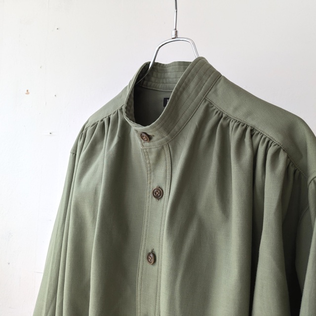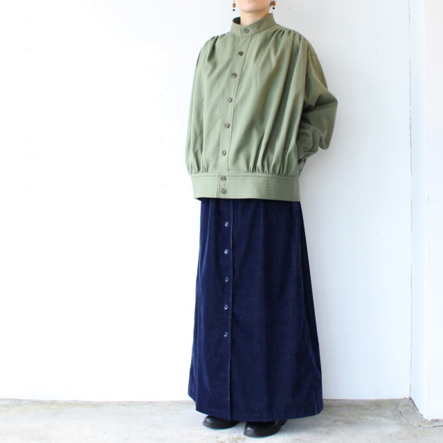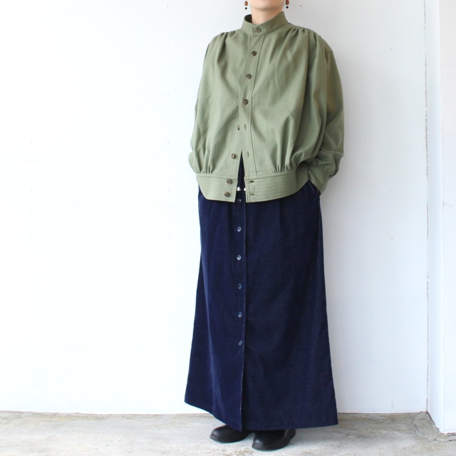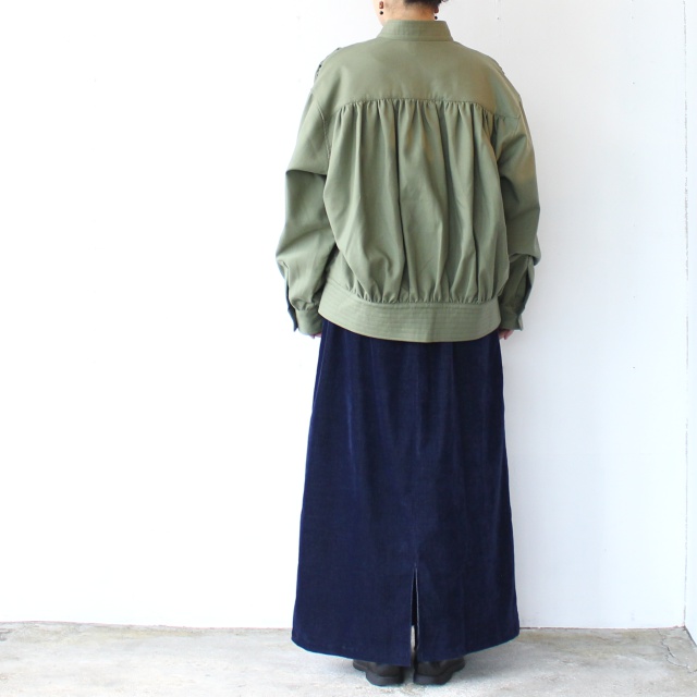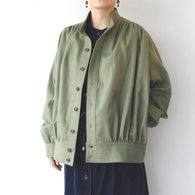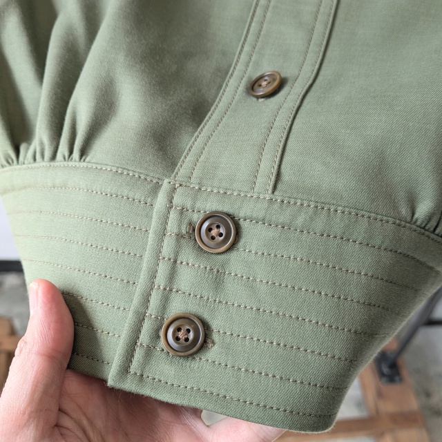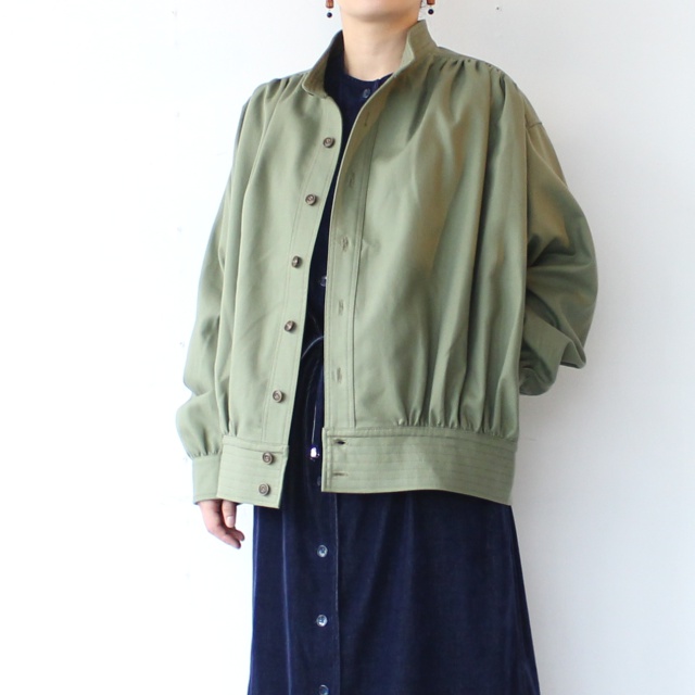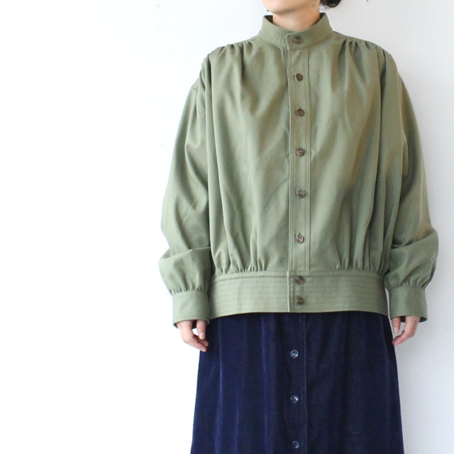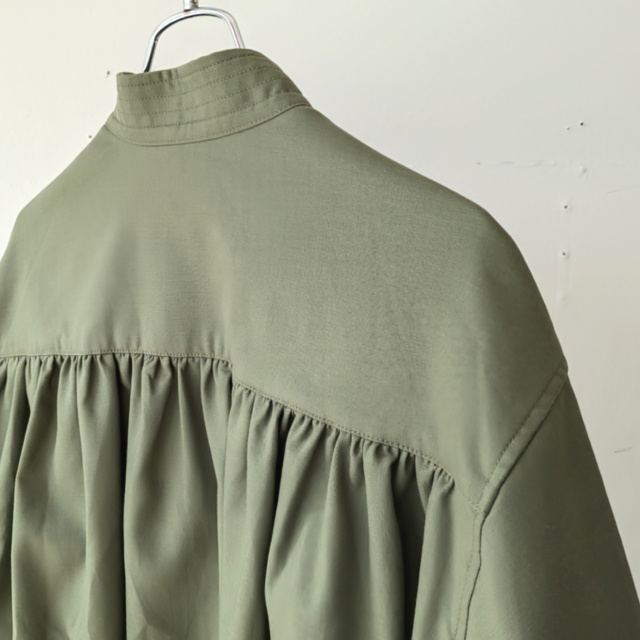 襟や裾に複数のステッチワークでワークテイストのアクセントを入れつつ、肩や背中のヨーク部分には丁寧にギャザーをとることで、女性らしい華やかなデザインも加えています。