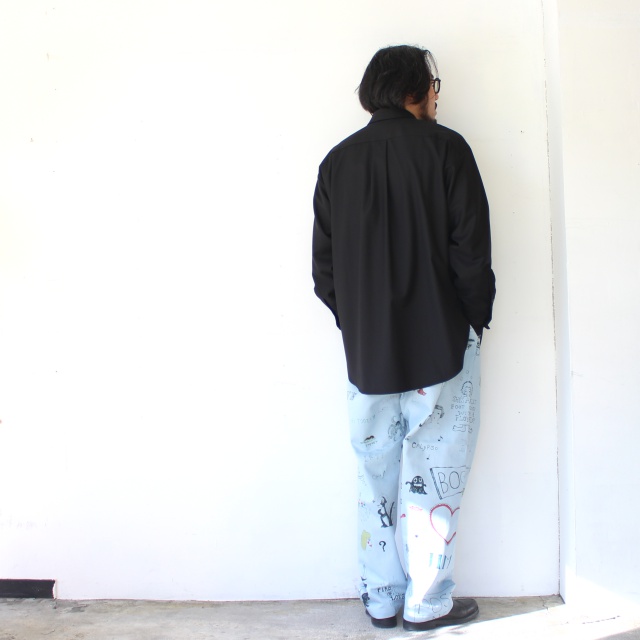 ウェストはゴム+紐の仕様で、シルエットはワイドテーパード。