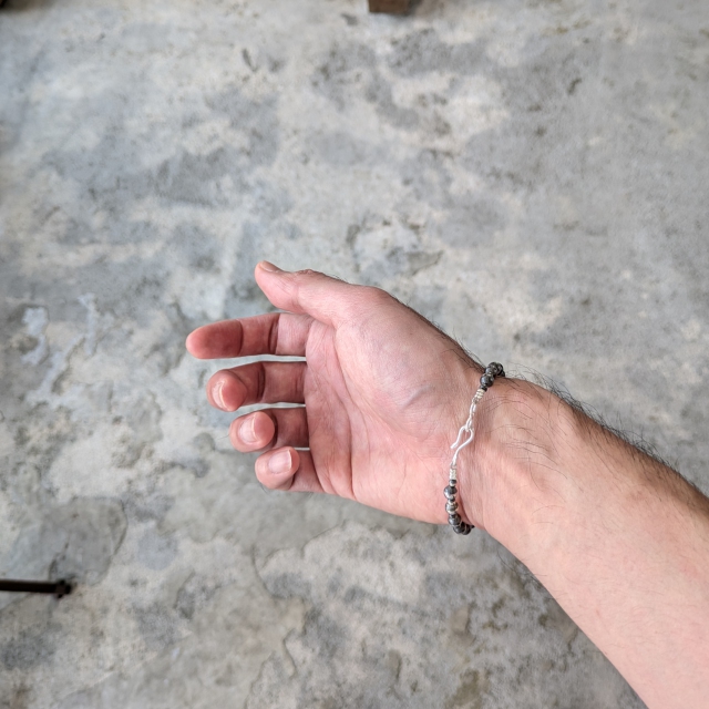 手作業で半球状にくり抜いたシルバーを一つに溶接して完成するナバホパールを使用し、重ね付けにも適したオールハンドメイドのブレスレットです。