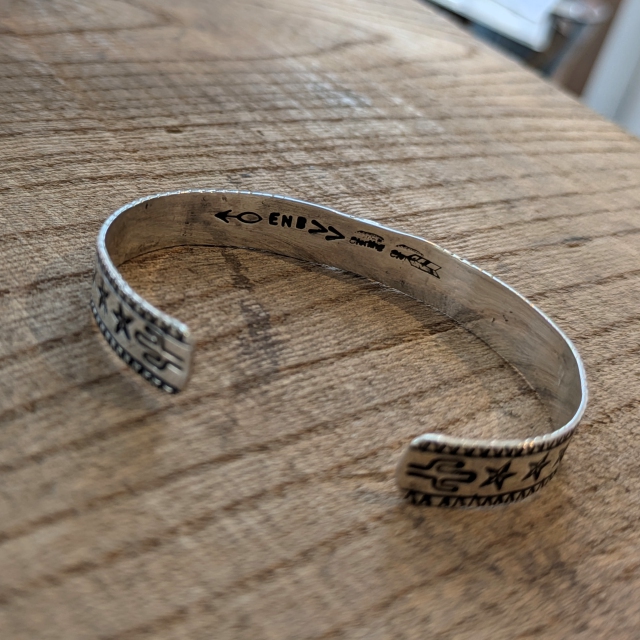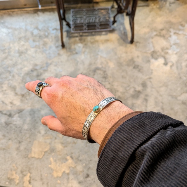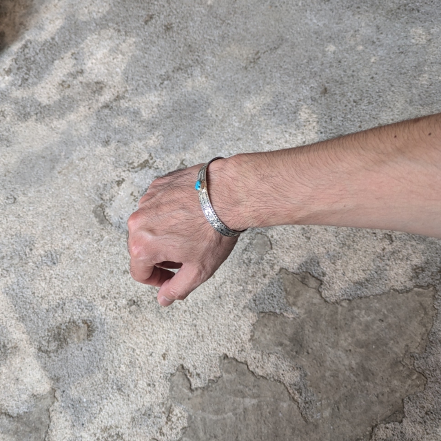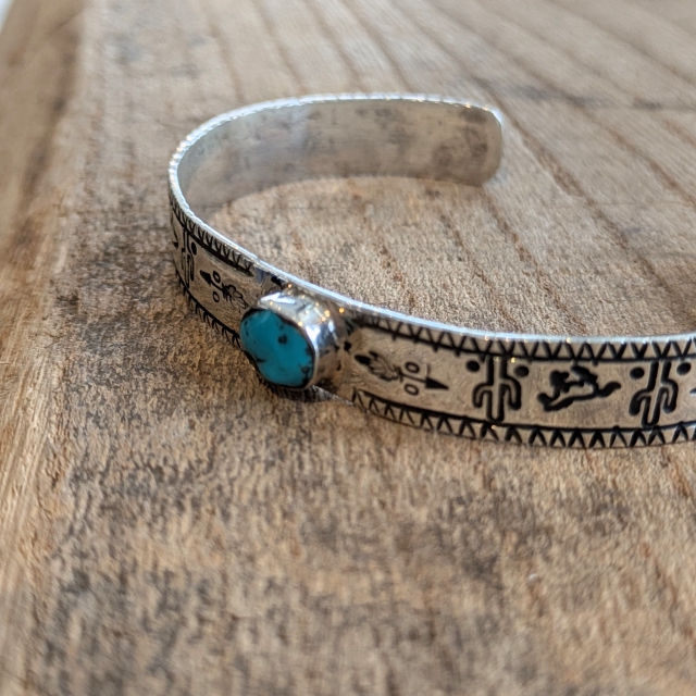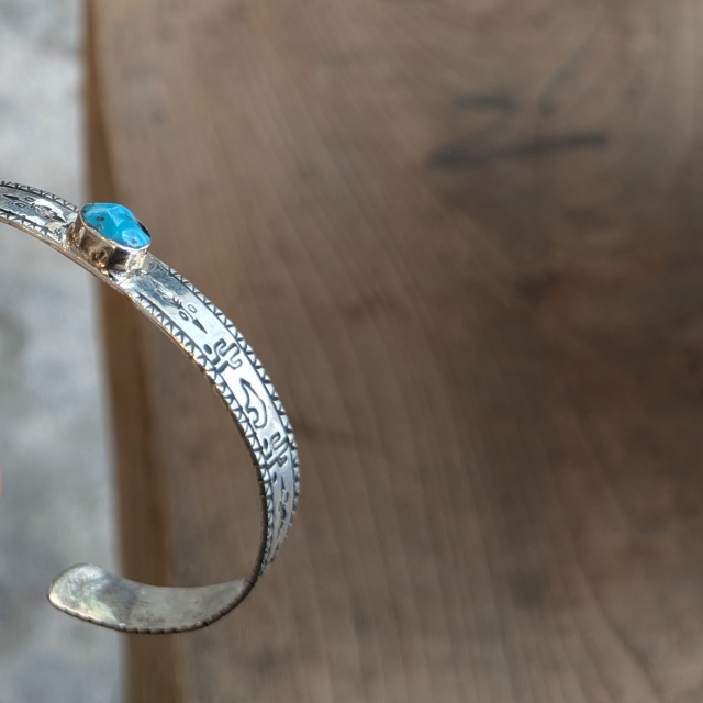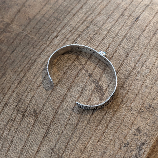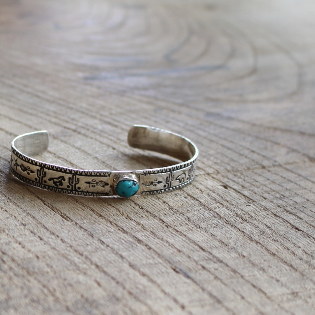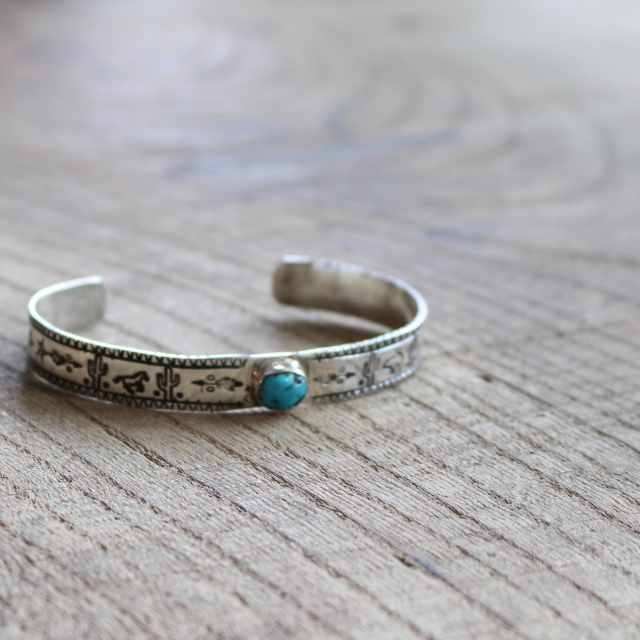 シルバー×ターコイズを組み合わせたバングルで、ボリュームを抑えつつ、小ぶりなターコイズがちょうど良いアクセントになったデザイン。