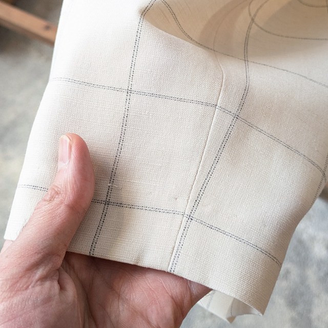 ポリエステル混リネン生地の清涼感が魅力の生地を使い、股上深めなワイドアンクルシルエットに仕上げています。