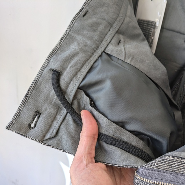 太ももはゆとりを持たせ、裾にかけて綺麗なテーバードがきいたスラックスです。