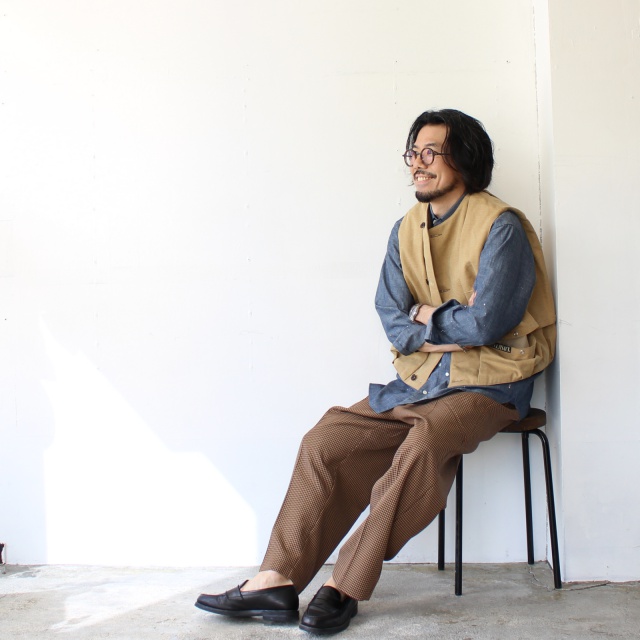 中綿のように厚みのあるベストで、シャツやスウェットの上にアウターとして着てもらうのがGood。