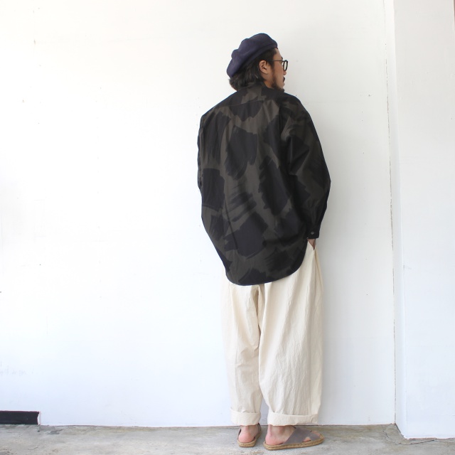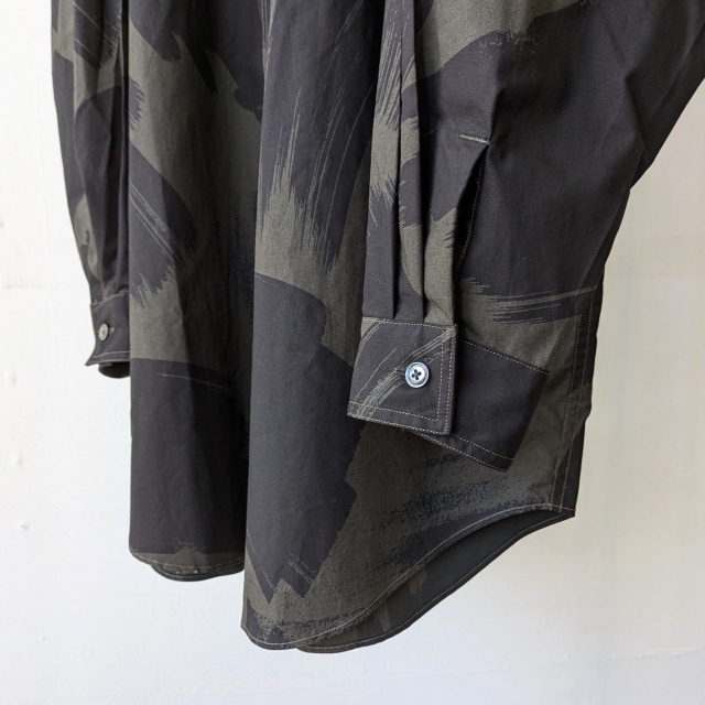 オリジナルのブラッシュプリントを施した40/タイプライター生地を使ったバンドカラーシャツ。