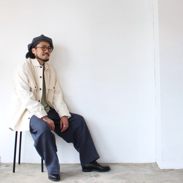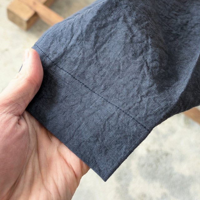 軽めな生地ですが透け感はなく、天日干しでフェード感のある色みと、初めからシワ感を加えているので洗濯もしやすくデイリーに着やすいのが魅力。