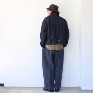 ウェストはインタック、極太のワイドテーパードシルエットで、股下レングスは長すぎずに綺麗にまとまります。
