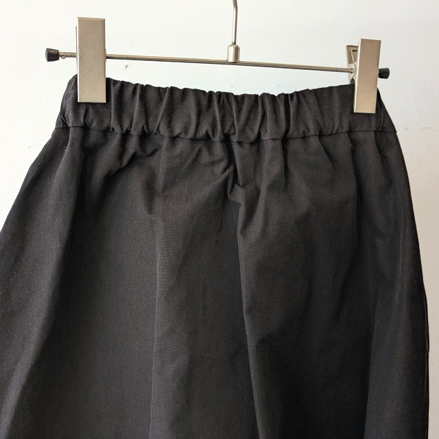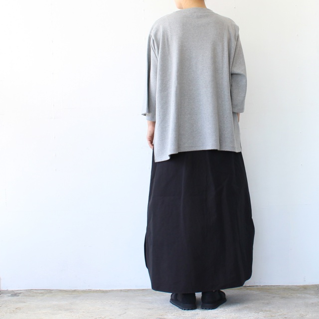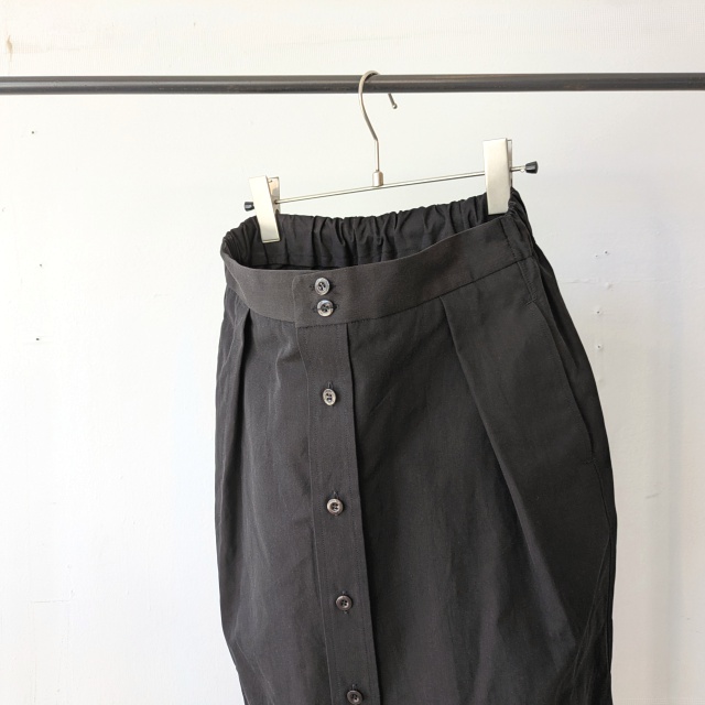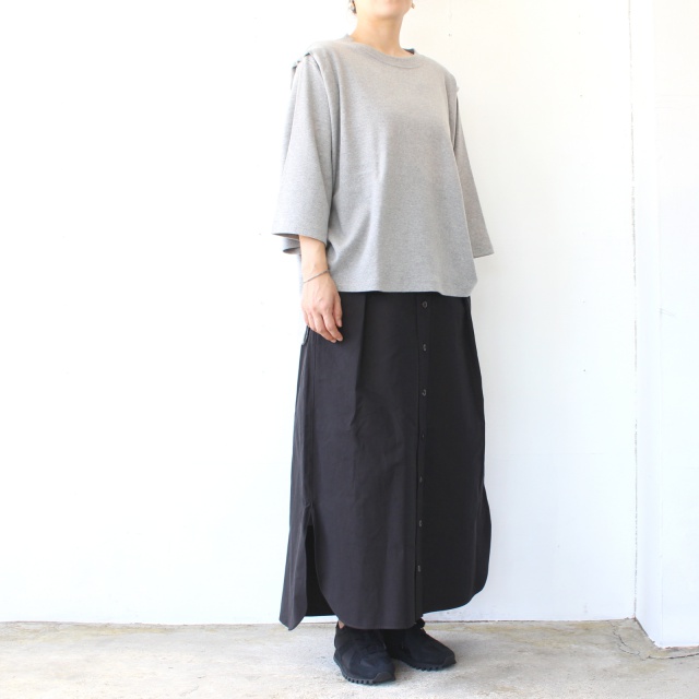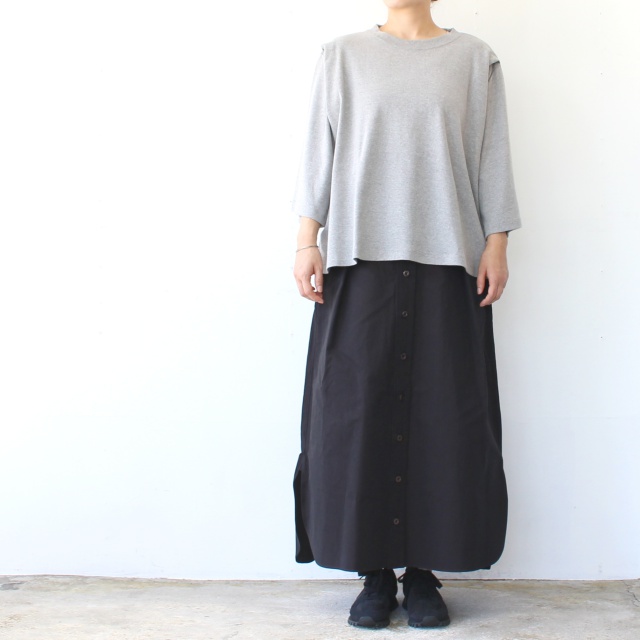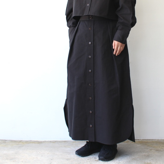 前立てや裾のラウンドカット、三角マチ等、シャツのディテールを取り入れたロングスカート。