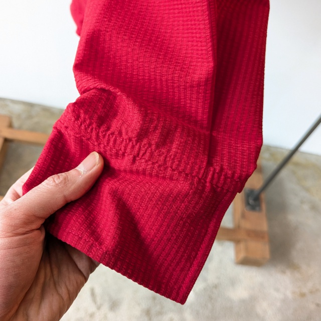 ドルマン型のスリーブに、袖のボリュームとシャツのようなカフスで、スポーティーになりすぎないバランスに仕上げています。