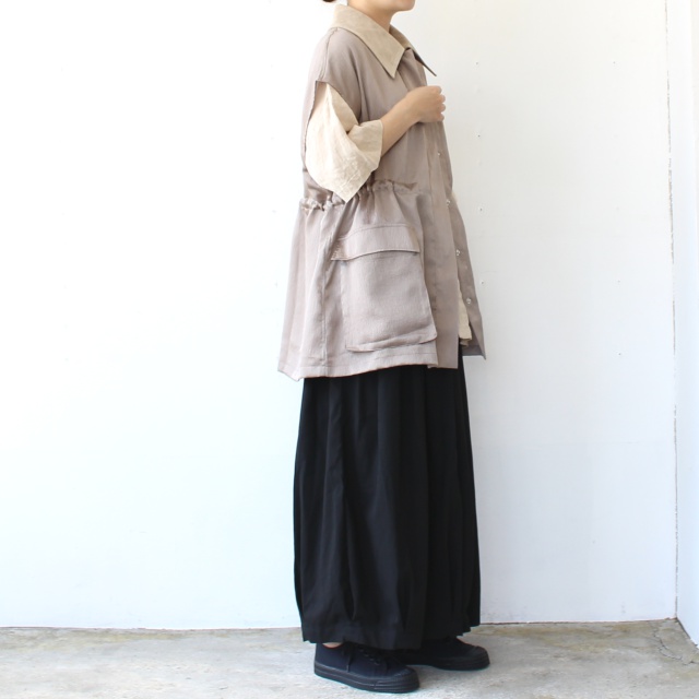 ゆったりとしたシルエットながら、ウエストドローコードでギャザーが作れるのでサイズバランスも安心。
