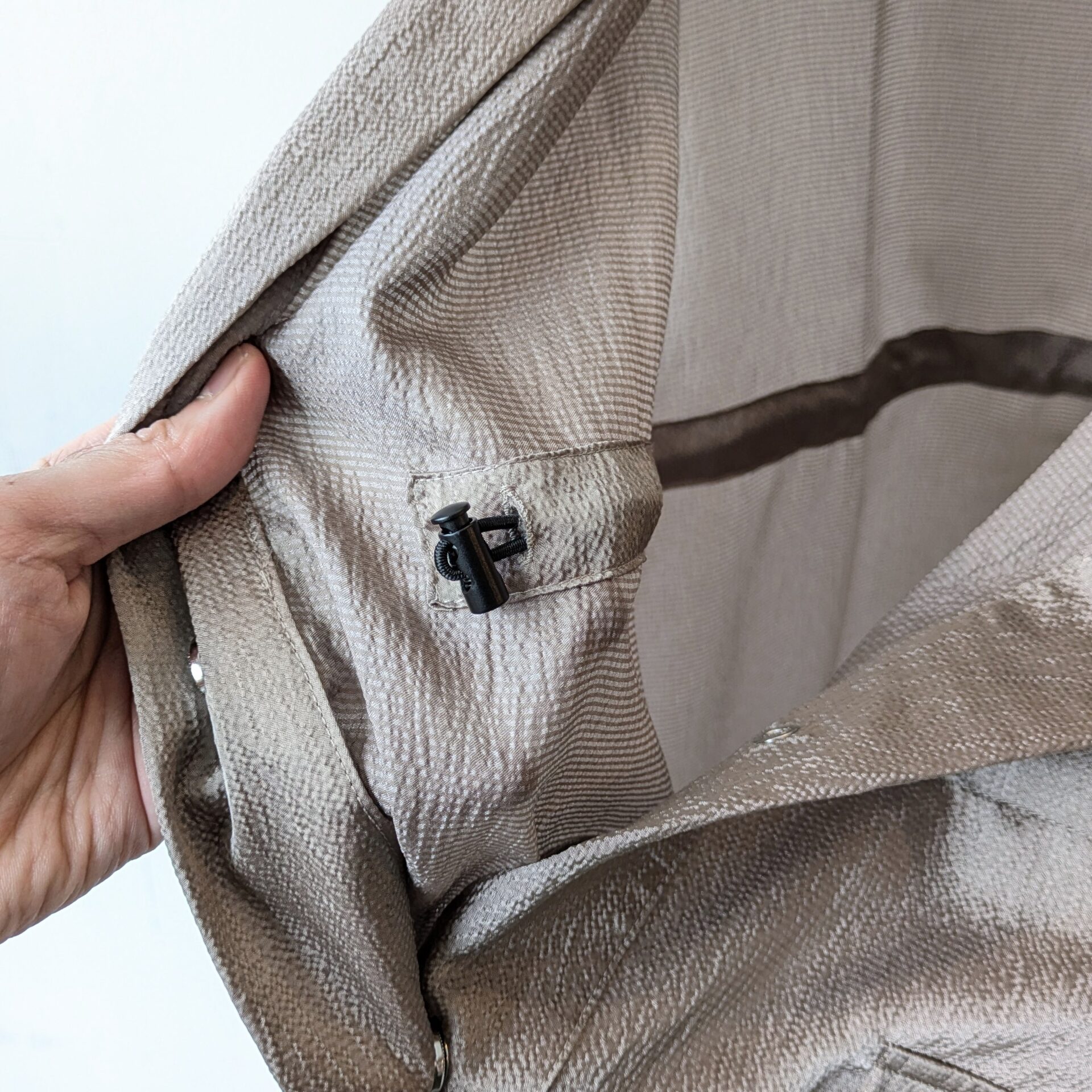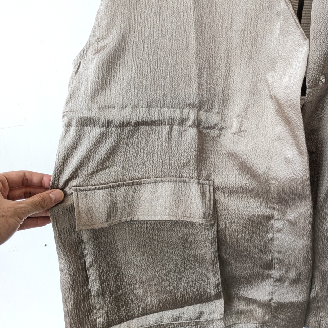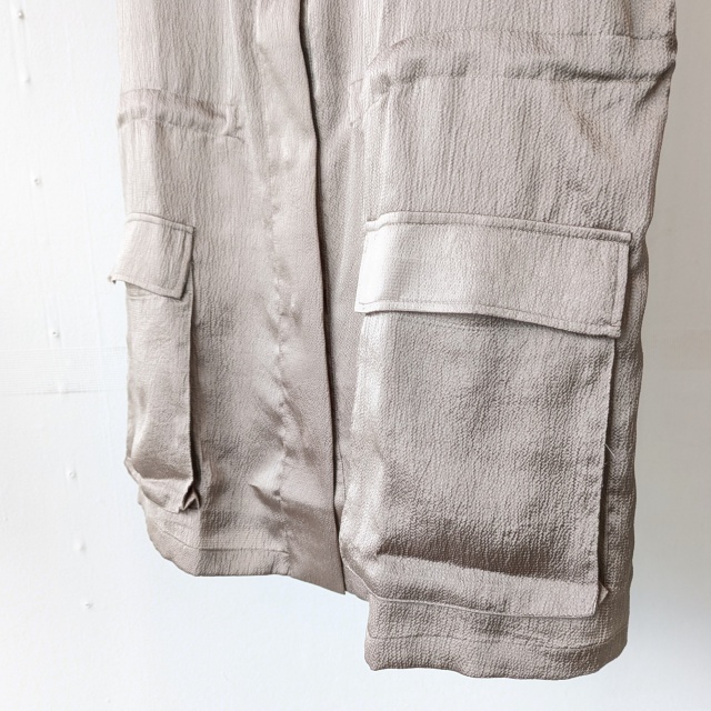 シルクのようなリサイクルポリエステルを使用したハンマーサテン生地は、凹凸感ある陰影と上品な光沢がありながら、ナチュラルな表情が特徴の生地。