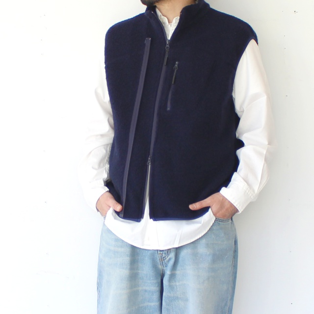 フロントに並列して配置した2本のZIPが特徴的なスタンドネックベスト。