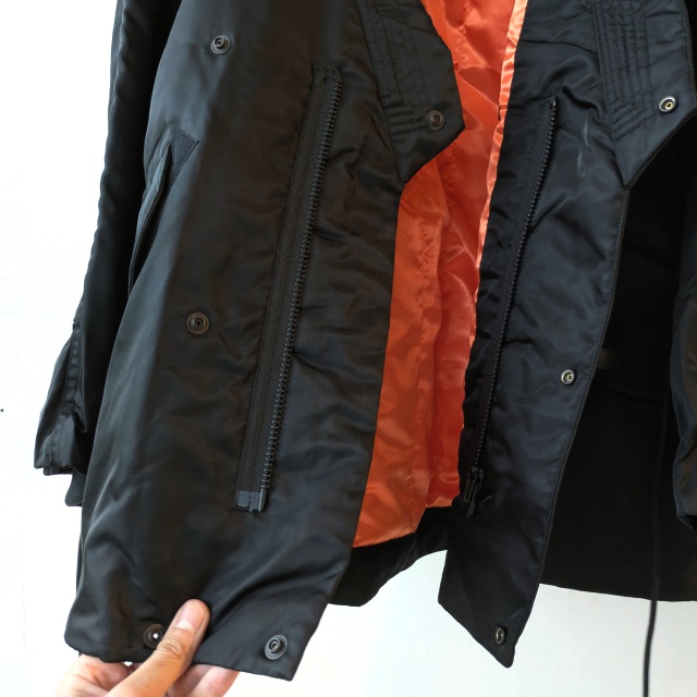 表地、裏地はアルファーインダストリーズ社N3Bに使用されているオリジナル素材を使用し、中綿にはプリマロフト、防寒着としてのハイテク機能素材を使用。