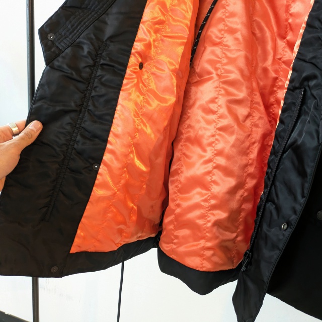 表地、裏地はアルファーインダストリーズ社N3Bに使用されているオリジナル素材を使用し、中綿にはプリマロフト、防寒着としてのハイテク機能素材を使用しています。