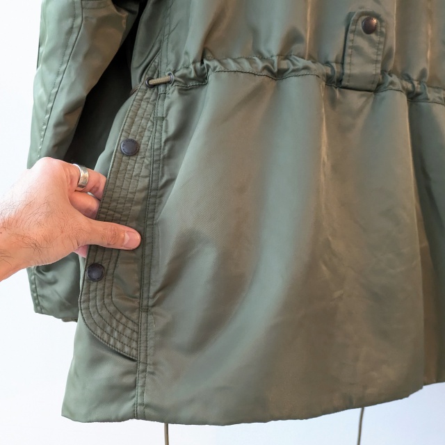 フロントは胸のハンドウォームポケット、腰のフラップポケット、ウェストのスピンドルデザインが特徴。