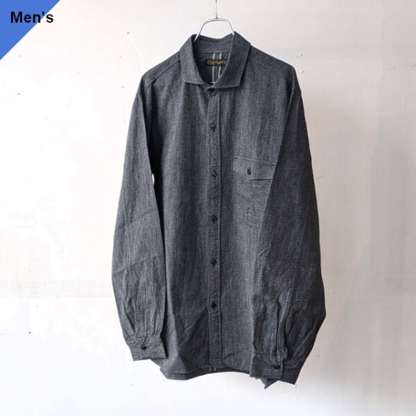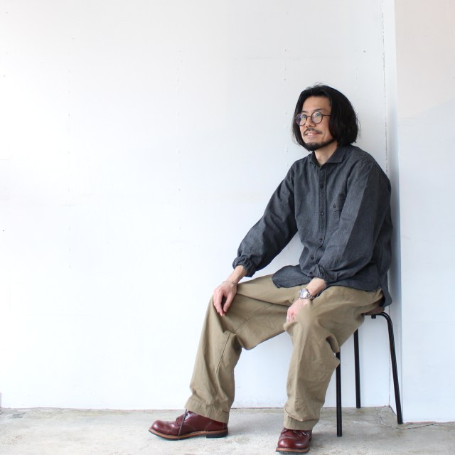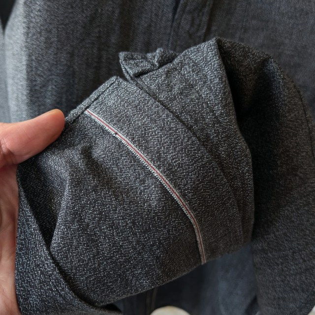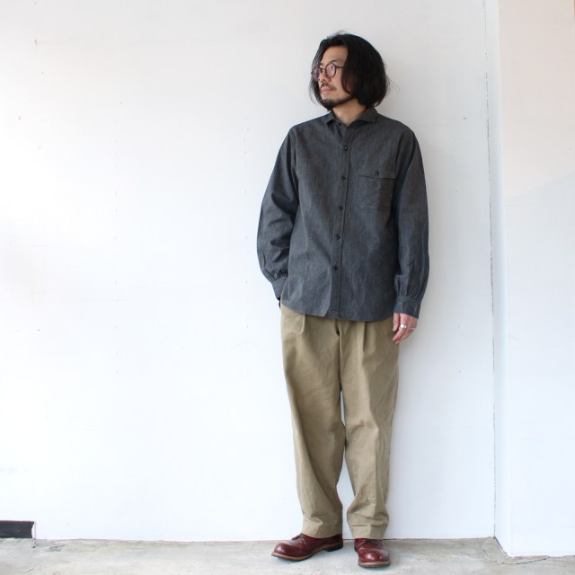 セルビッジシャンブレー生地を使用したワークシャツ。