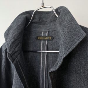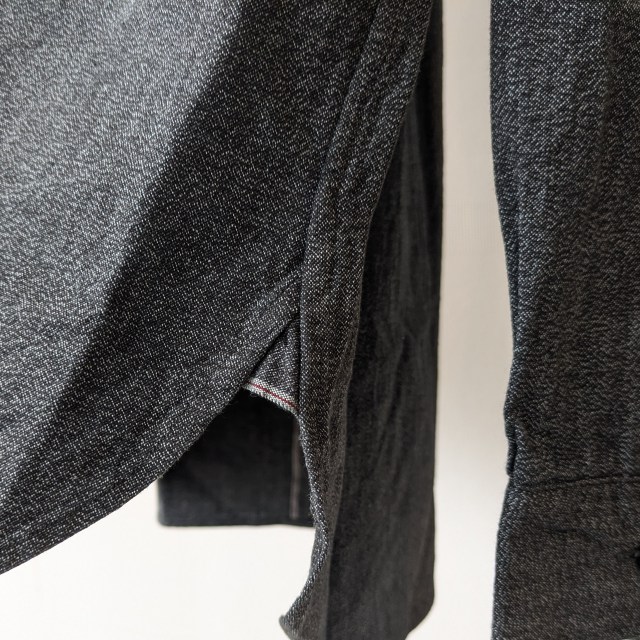 前立て裏や裾の三角マチ、背面中心の縫い合わせにセルビッジ部分を使い、さりげないポイントを。