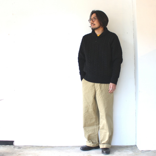 上質で厚手のケーブル編みニット生地に、ショールカラー、ボタンはナットボタンを使用。
