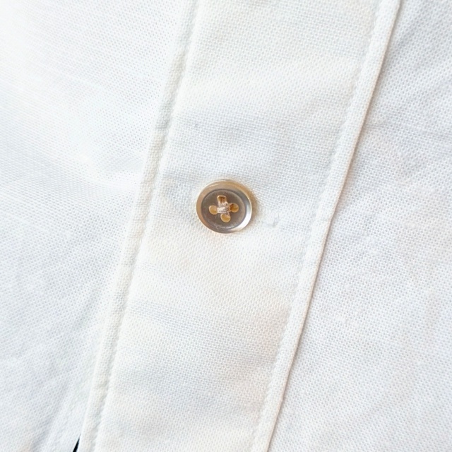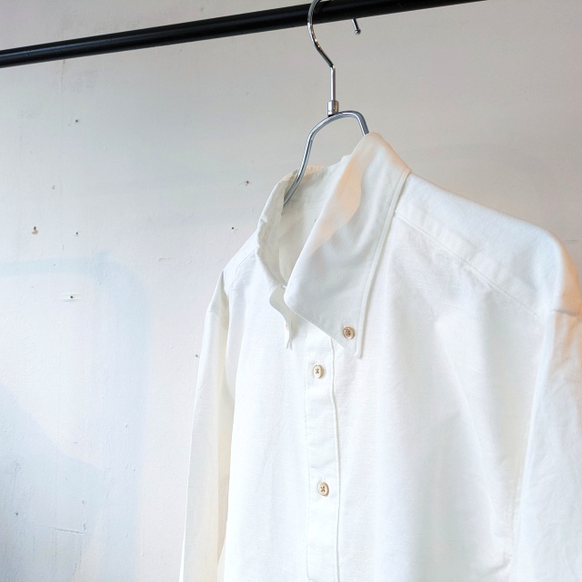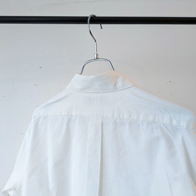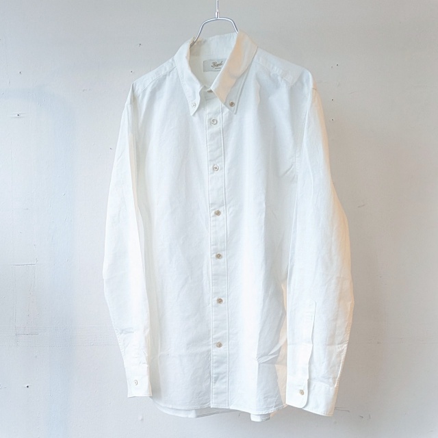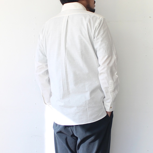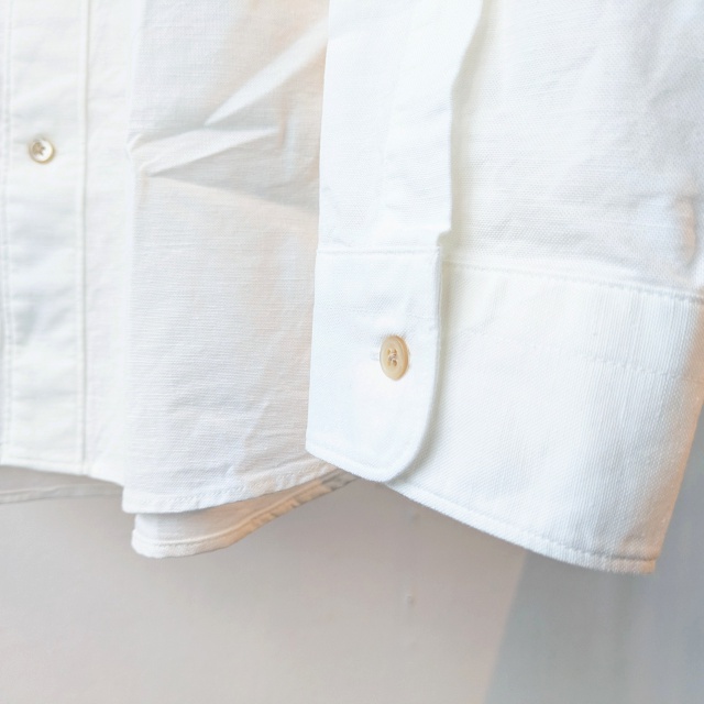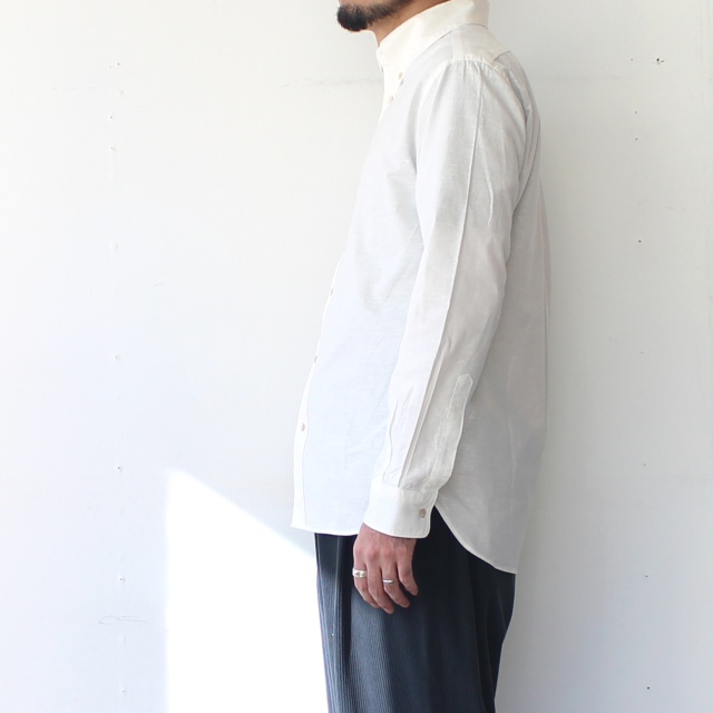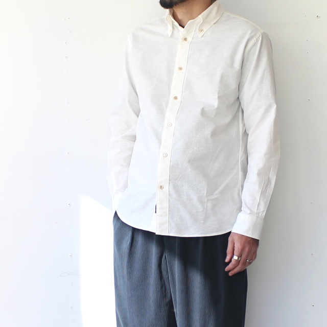 緯糸に短繊維のムラ糸を使用し、凸凹感のあるドライタッチな生地で作った無地のボタンダウンシャツ。