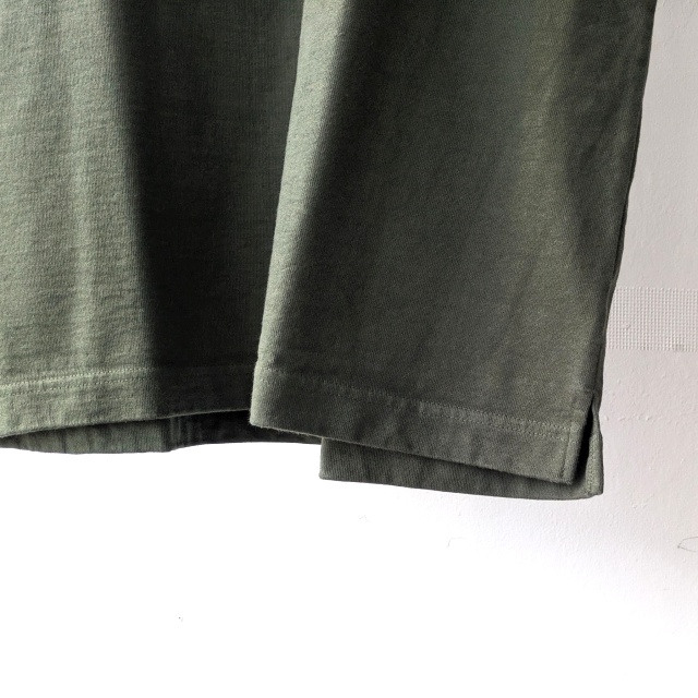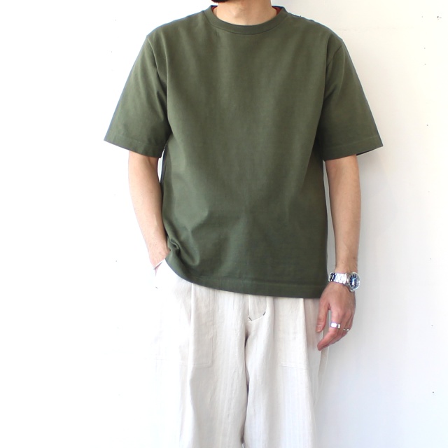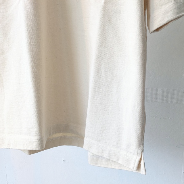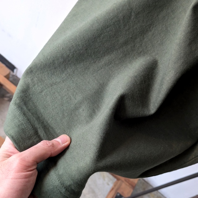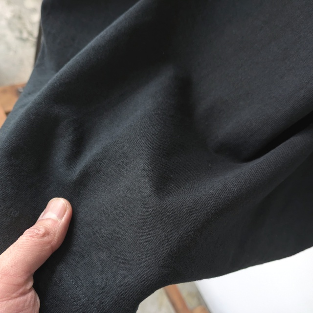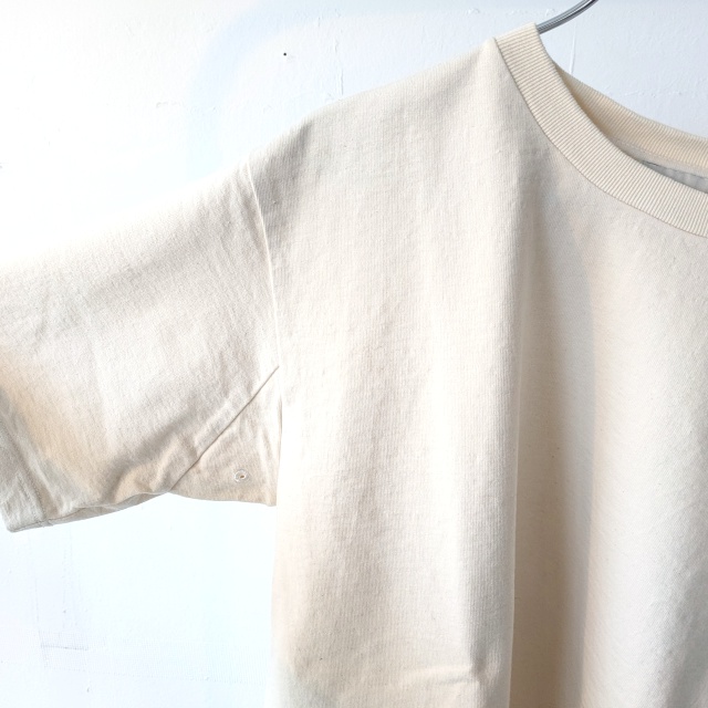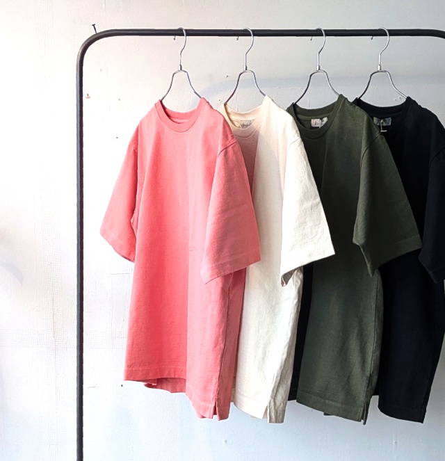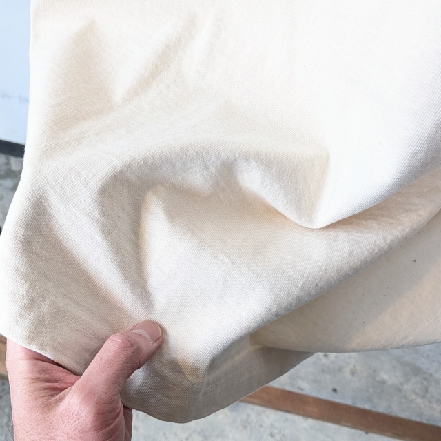 丸編み裏毛機を使用し、ギリギリまで度詰めで編み上げた国産天竺生地のヘビーウェイトTシャツ。