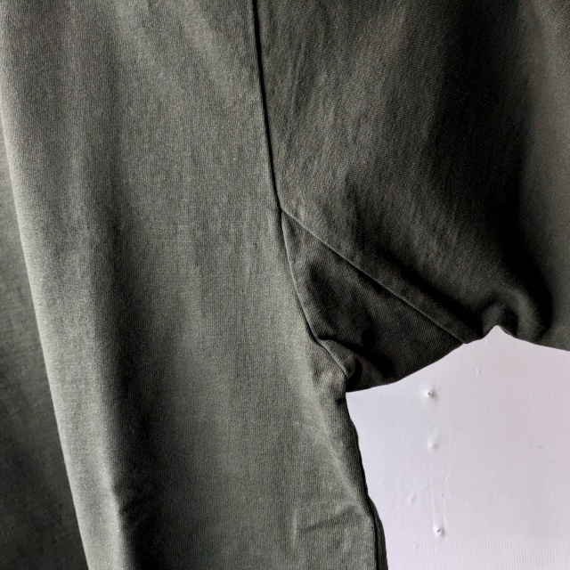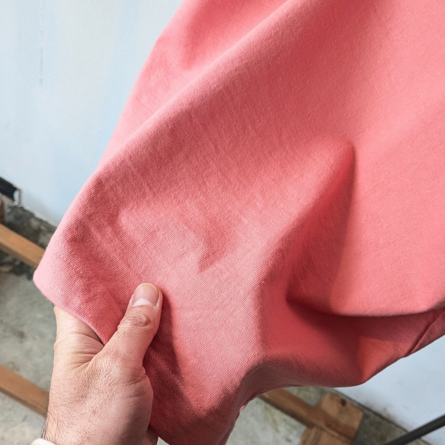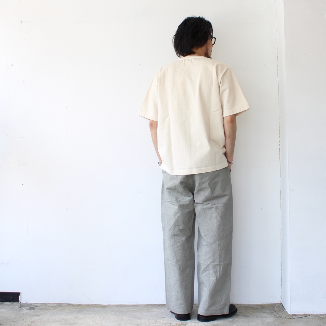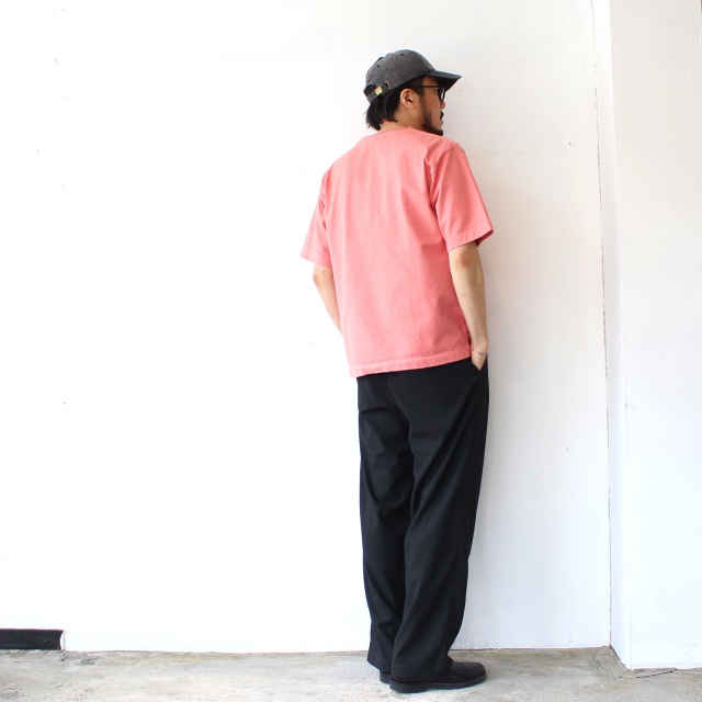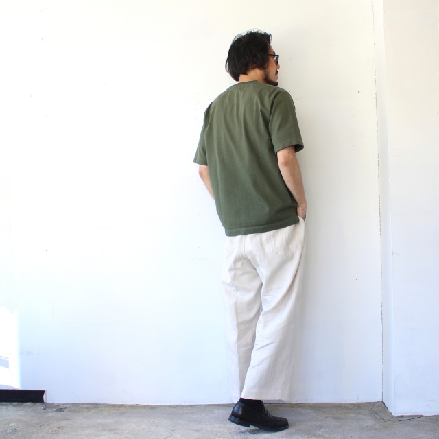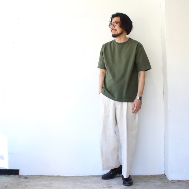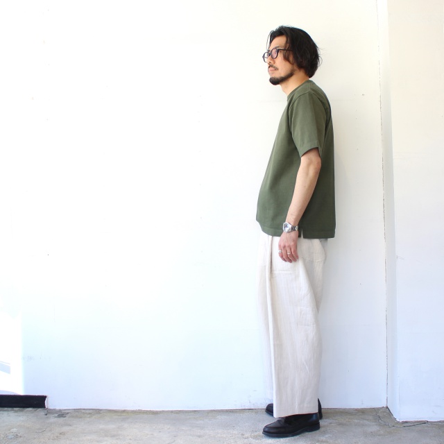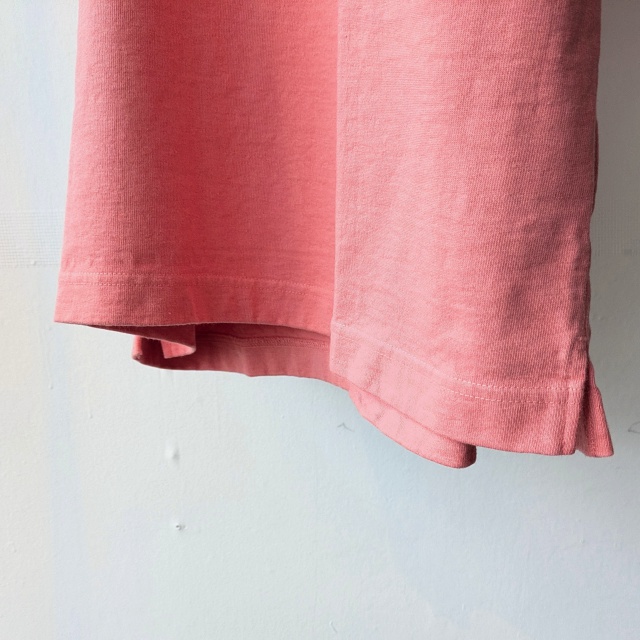丸編み裏毛機を使用し、ギリギリまで度詰めで編み上げた国産天竺生地のヘビーウェイトTシャツ。