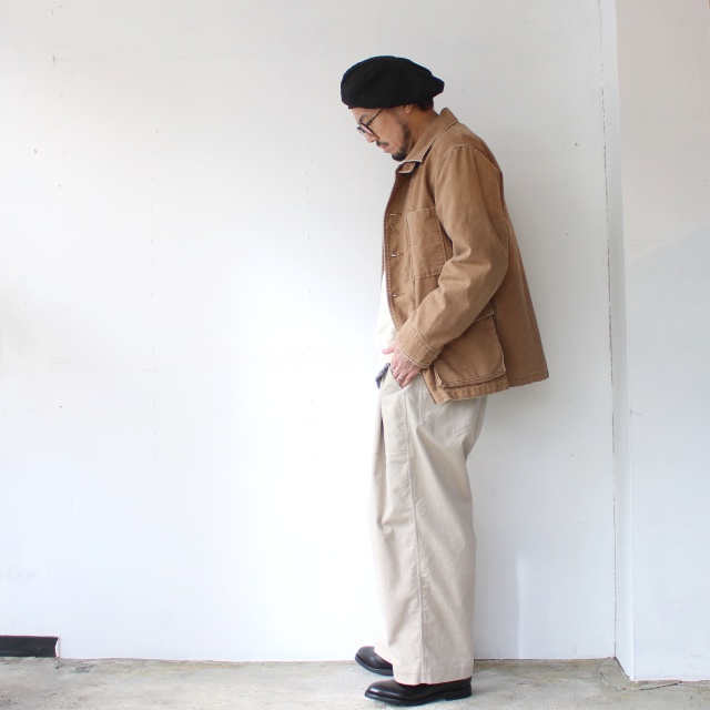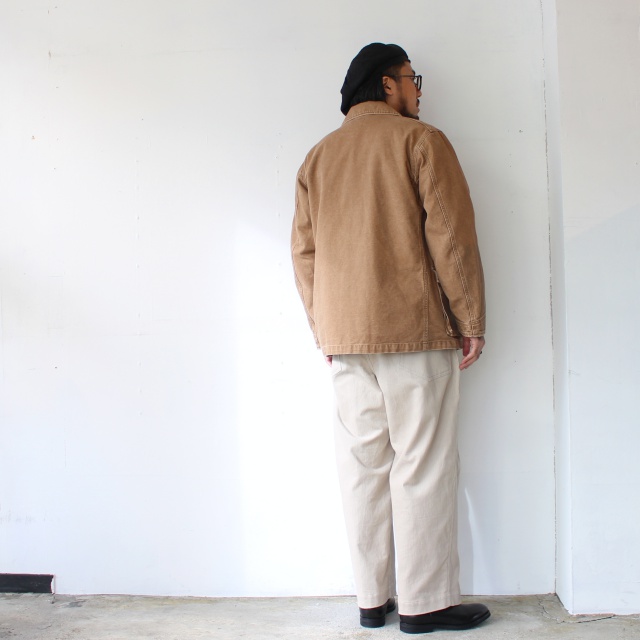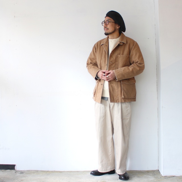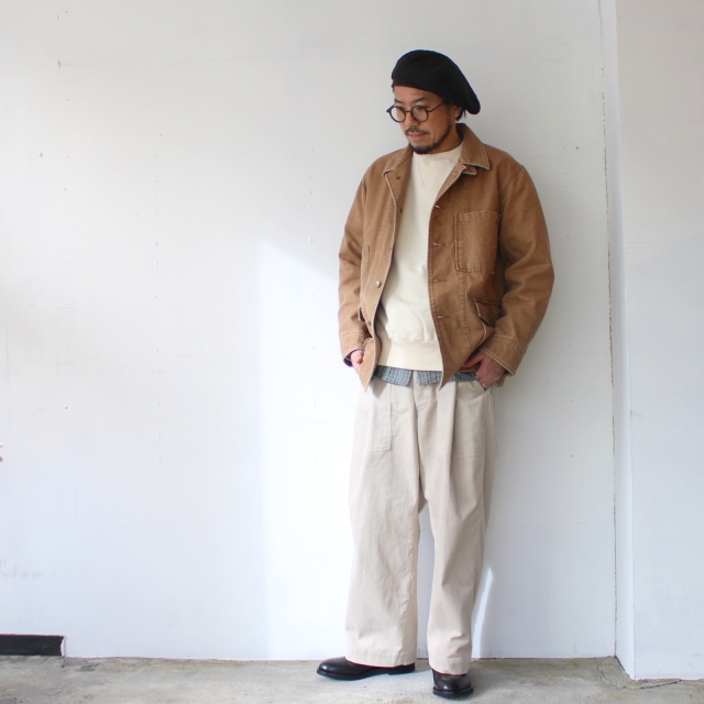 染料技術に乏しかった頃の中まで染まらないダックをリプロした中白素材を使用し、製品にて ストーンバイオ加工を施し履き込んだような風合いを持つ。ゆったりとしたシルエット。