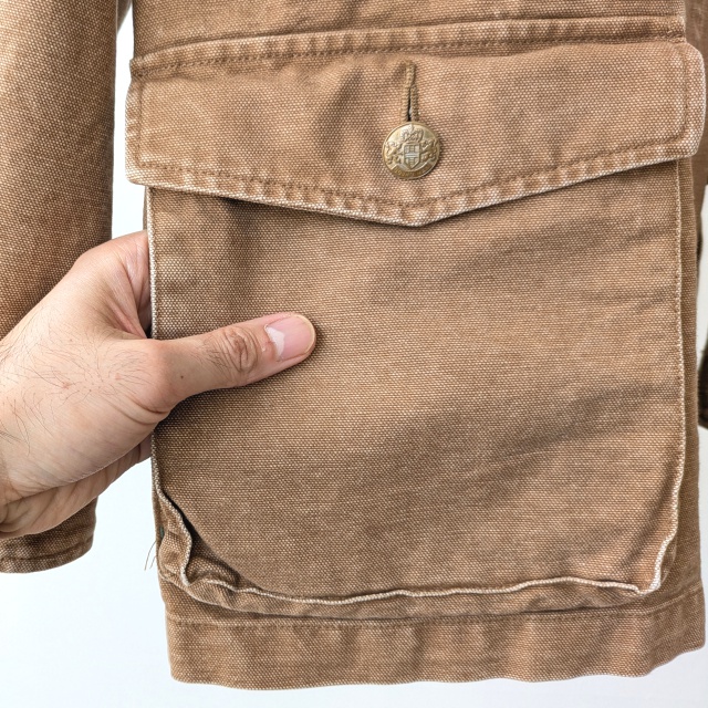 チンストラップ付きのオープンカラーマチ付きの腰ポケットなど別のワークウエアのディティールを融合させた。