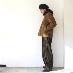 ドッグイヤーカラーとラグランスリーブという、トラディショナルなハリントンジャケットの基本を踏襲したSoundmanらしいアウター。