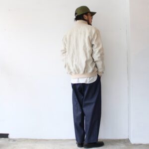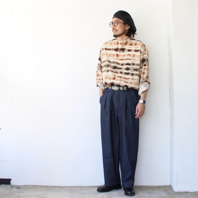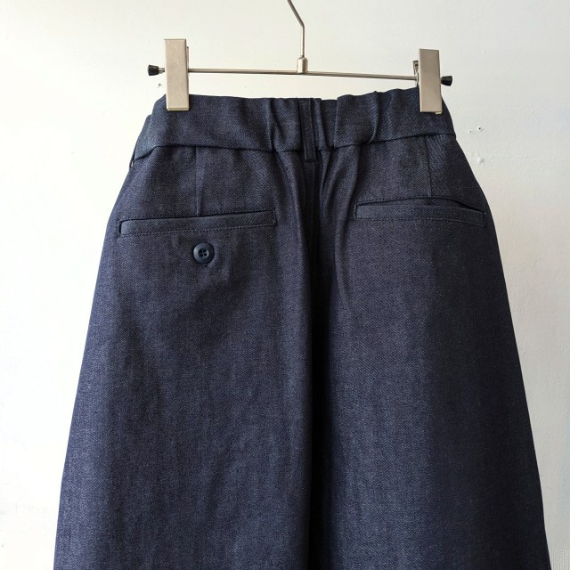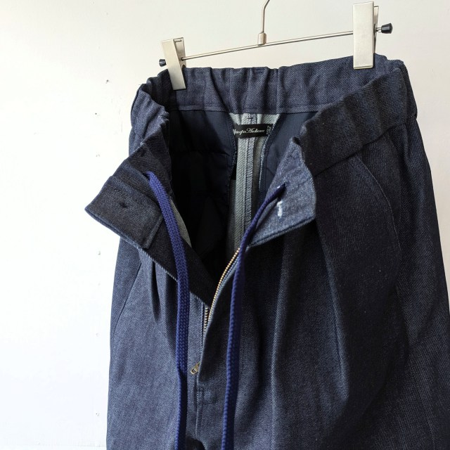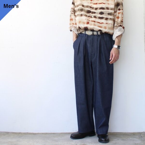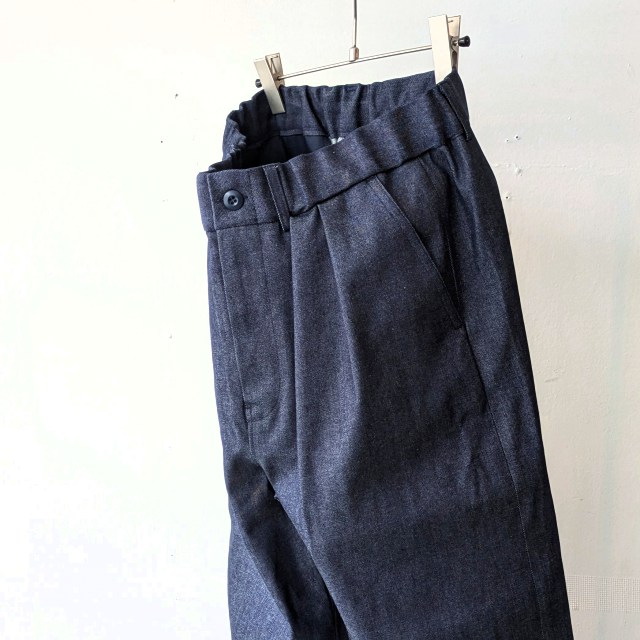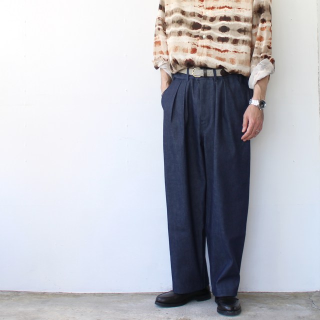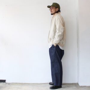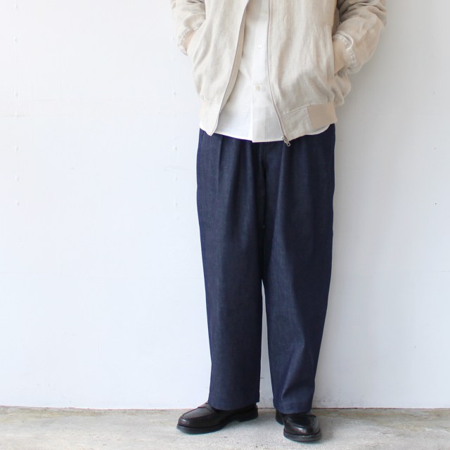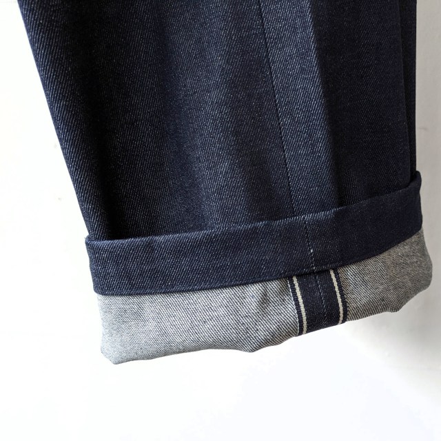 生地には岡山県の白耳デニムを使用した2タックデニムトラウザー。