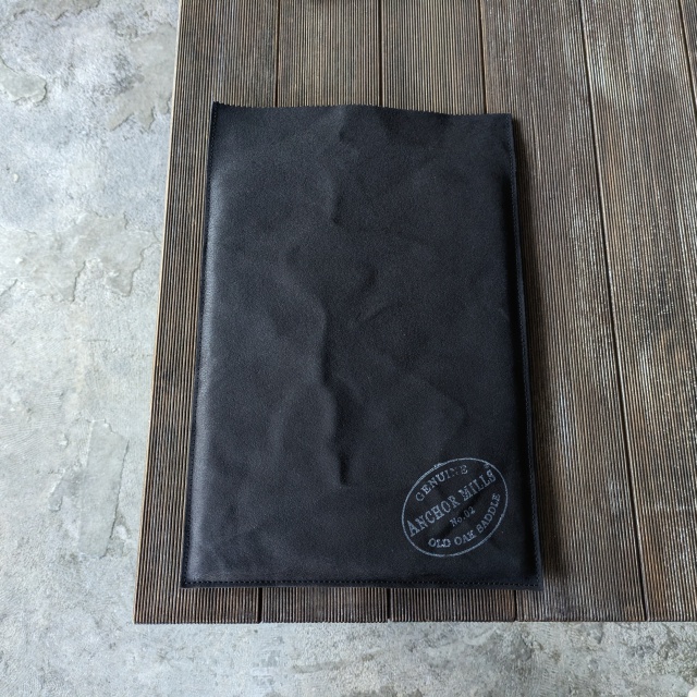 ラフアウト(牛革の床面)を手染め、オイル、コガシ加工、”ANCHOR MILLS 社製”スタンプなどでヴィンテージ紙のような風合いに仕上げました。